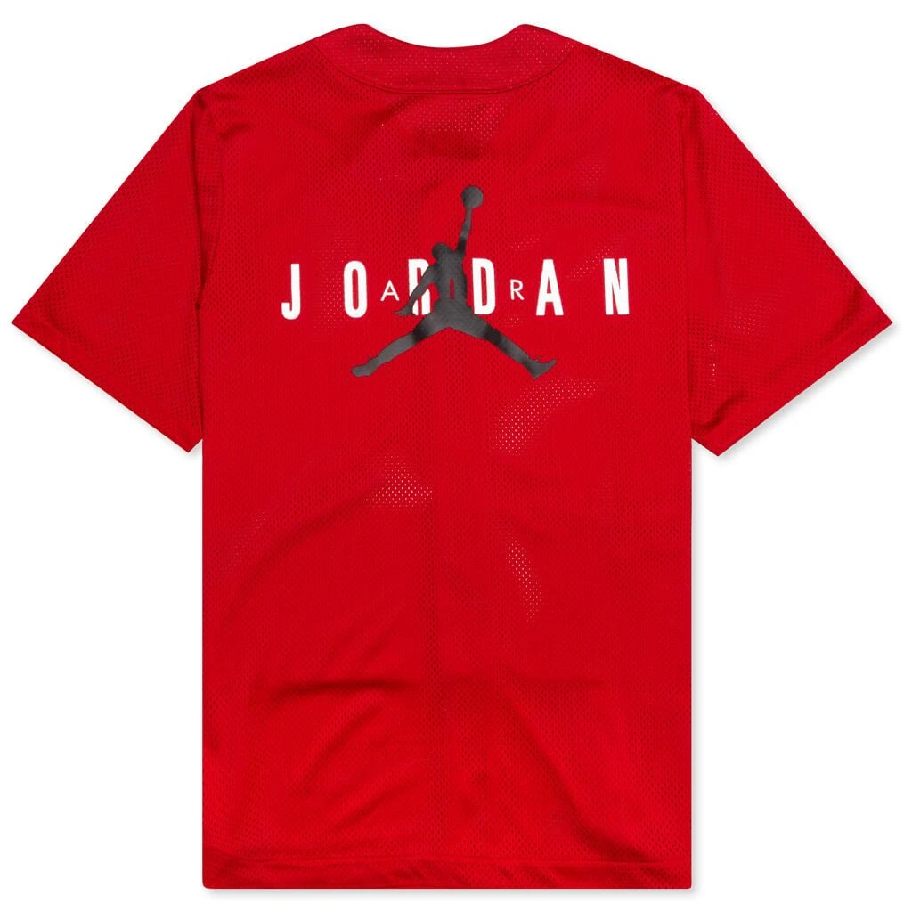 Jordan tailors apparel for sport and style, fusing modern technologies and fabrics like Tech Fleece and Dri-FIT combine performance and comfort for some of the best tech wear in the industry. Pictured is the Air Jordan Jumpman Air Mesh Jersey in Gym Red/Black.