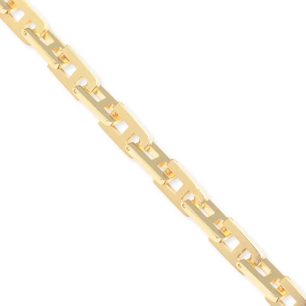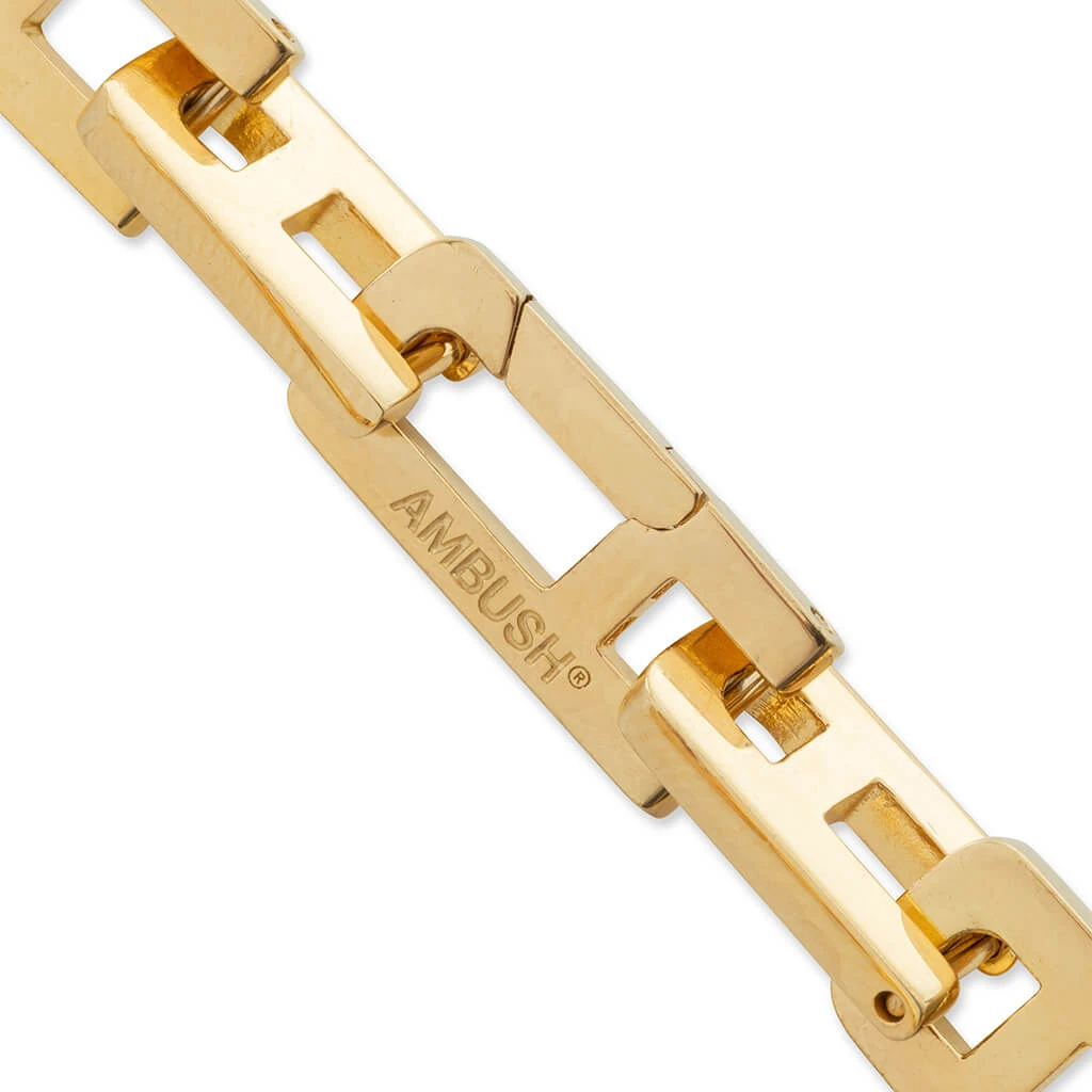 AMBUSH® began as an experimental line of jewelry – innovative pop art inspired designs capturing a distinct Tokyo aesthetic. The iconic trademarked POW!® motif in particular received media coverage around the world. With apparel created as a can-vas to complete the story, AMBUSH® evolved into designing unisex collections. Pictured is the Ambush “A” Chain Necklace in Gold.