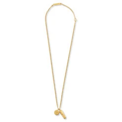 AMBUSH® began as an experimental line of jewelry – innovative pop art inspired designs capturing a distinct Tokyo aesthetic. The iconic trademarked POW!® motif in particular received media coverage around the world. With apparel created as a can-vas to complete the story, AMBUSH® evolved into designing unisex collections. Pictured is the Ambush KK Pill Charme Necklace in Gold.