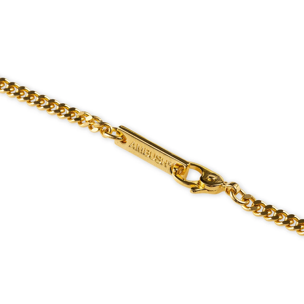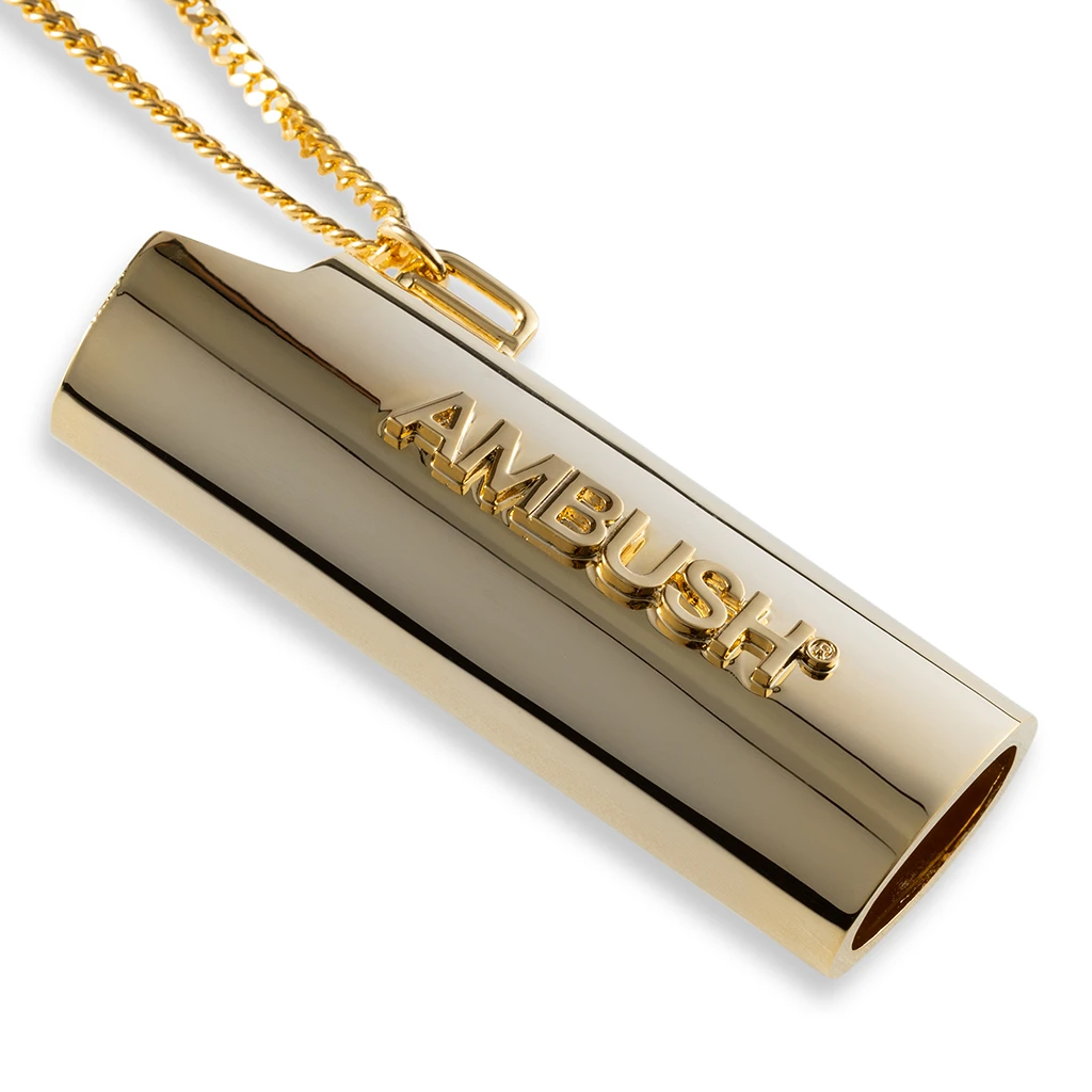 AMBUSH® began as an experimental line of jewelry – innovative pop art inspired designs capturing a distinct Tokyo aesthetic. The iconic trademarked POW!® motif in particular received media coverage around the world. With apparel created as a can-vas to complete the story, AMBUSH® evolved into designing unisex collections. Pictured is the Ambush Logo Lighter Case Necklace L in Gold.
