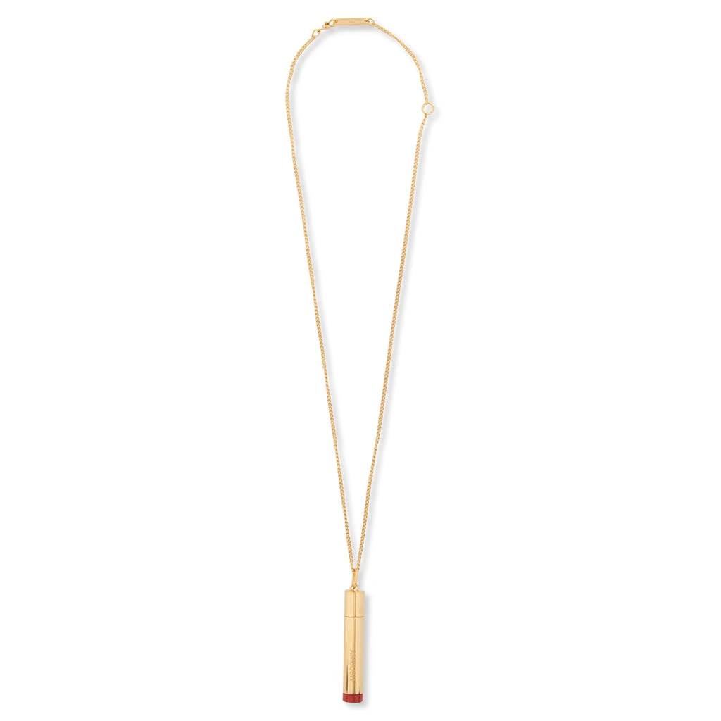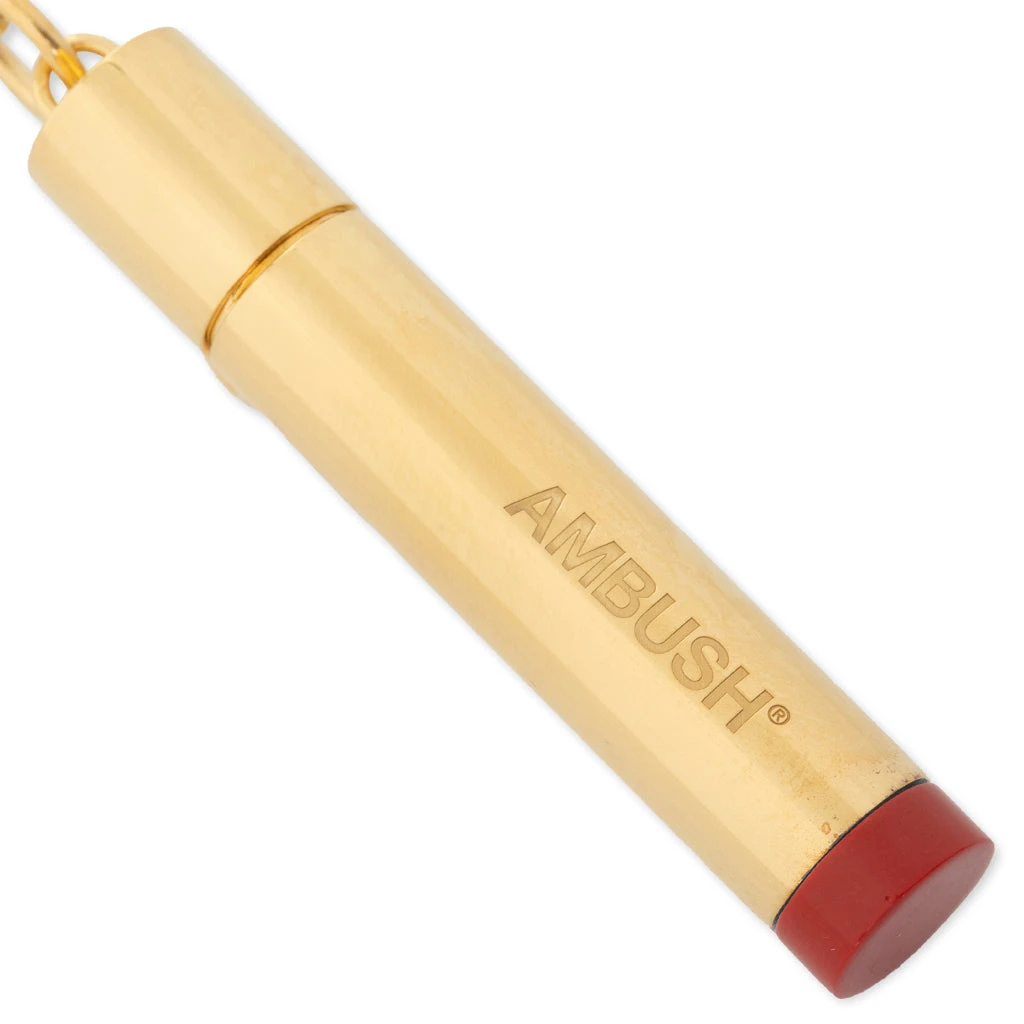 AMBUSH® began as an experimental line of jewelry – innovative pop art inspired designs capturing a distinct Tokyo aesthetic. The iconic trademarked POW!® motif in particular received media coverage around the world. With apparel created as a can-vas to complete the story, AMBUSH® evolved into designing unisex collections. Pictured is the Ambush Pill Case Necklace in Gold/Red.