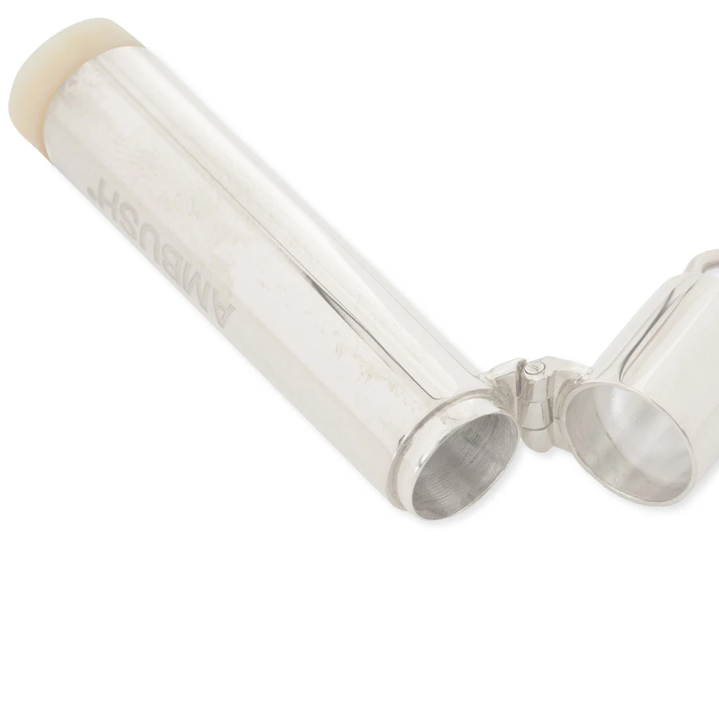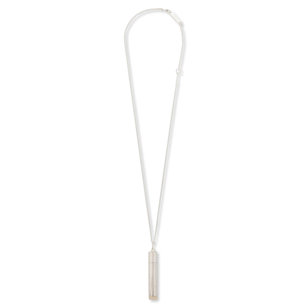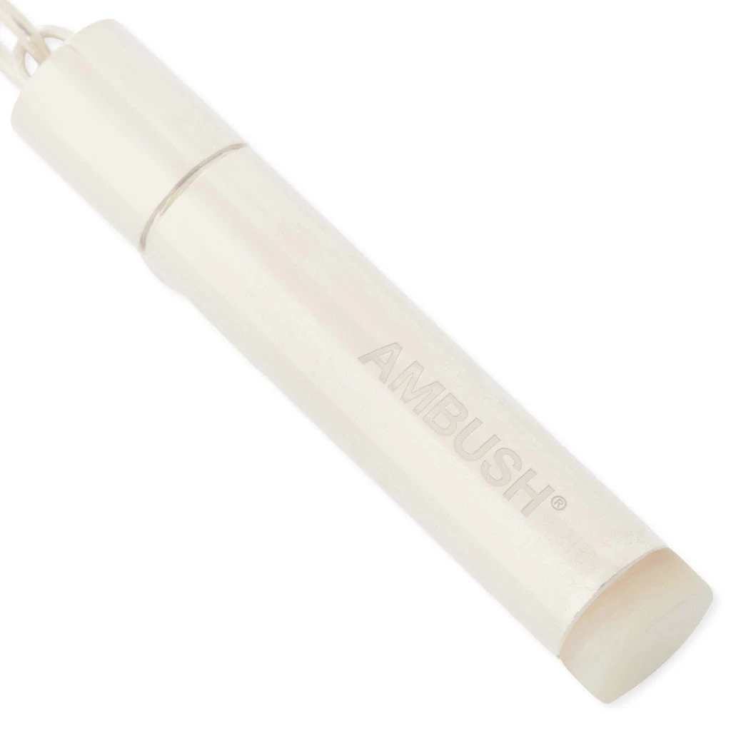 AMBUSH® began as an experimental line of jewelry – innovative pop art inspired designs capturing a distinct Tokyo aesthetic. The iconic trademarked POW!® motif in particular received media coverage around the world. With apparel created as a can-vas to complete the story, AMBUSH® evolved into designing unisex collections. Pictured is the Ambush Pill Case Necklace in Silver/White.