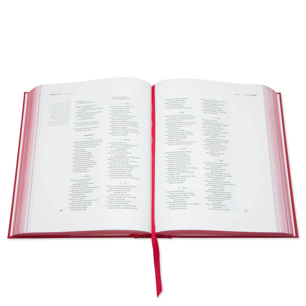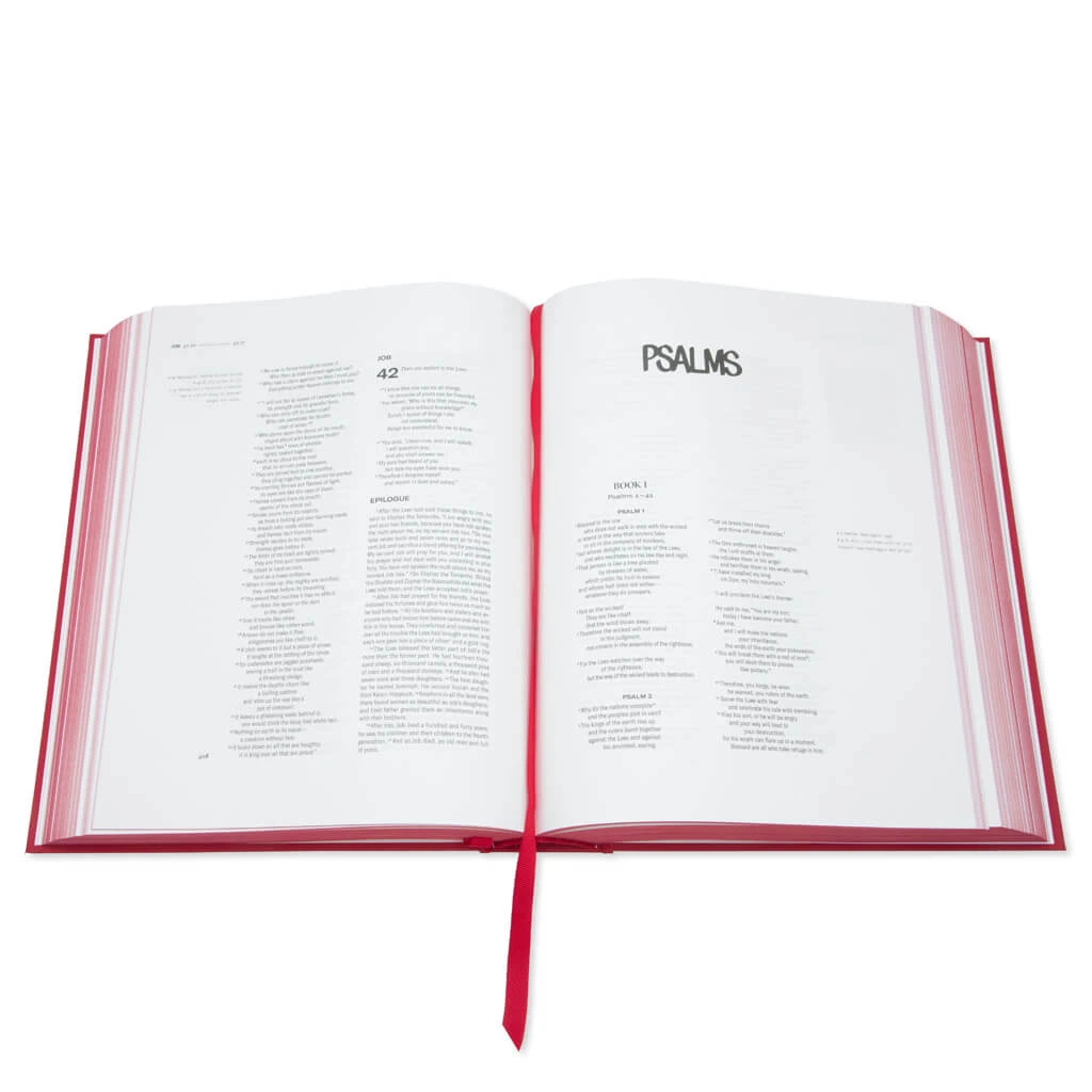 Taking a modern approach to the best-selling book in history, the GPC Bible is hand-written by graphic artist Eric Haze. Focusing on detail and craftsmanship, the book is met with two different shades of paper one for each Testament. Sustainably sourced, the pages are hand pressed with custom brass toolsets. A bookmark is created with Italian grosgrain for a premium design. Its crimson-colored cover is detailed with gold foil for a bold touch that works well with the overall design.Â