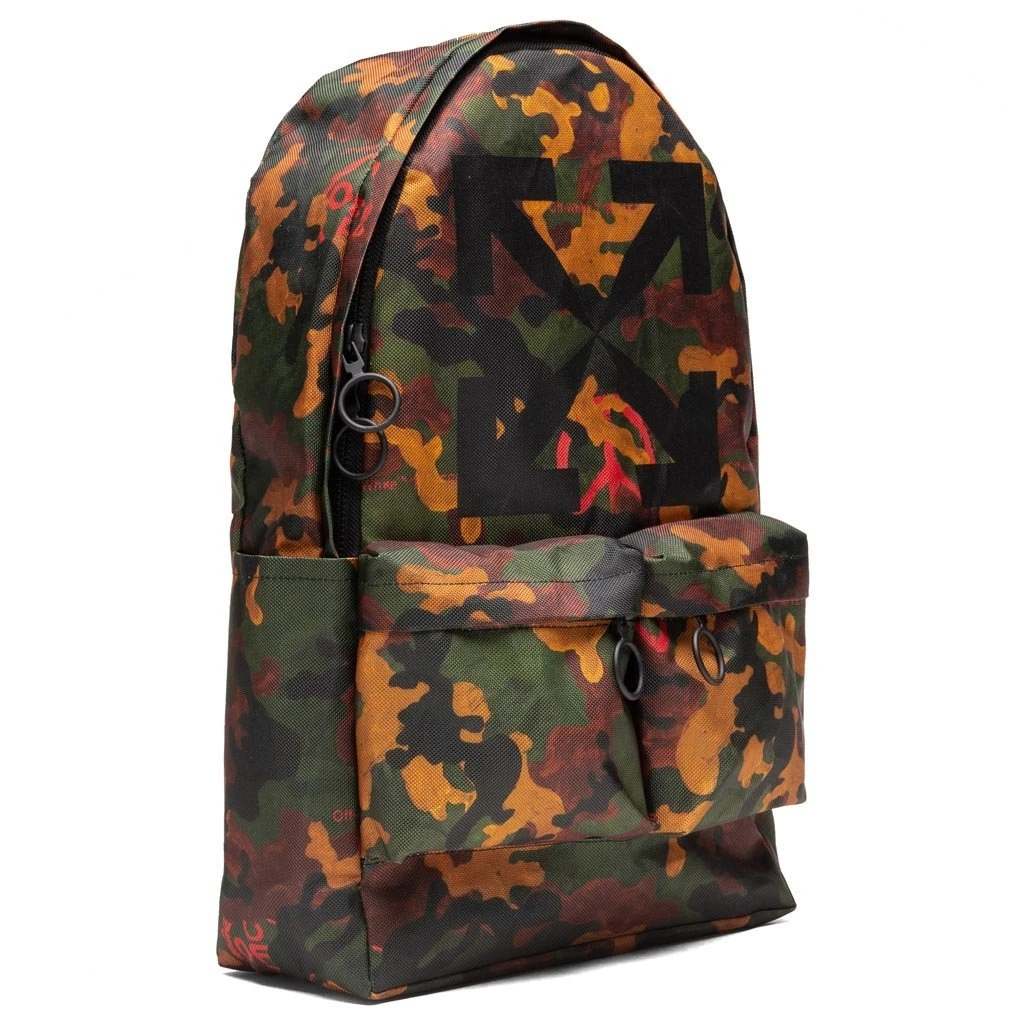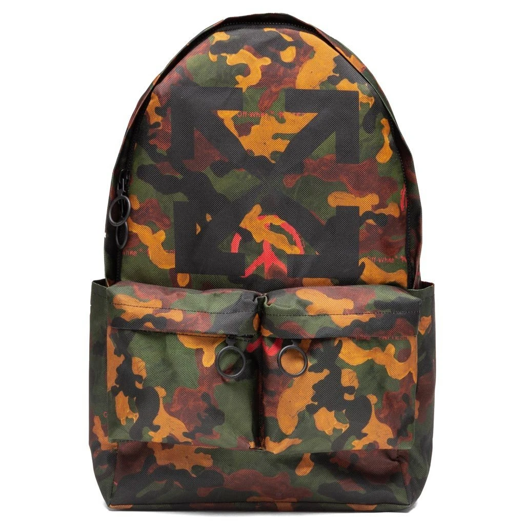Off-White c/o Virgil Abloh is a fashion label rooted in current culture at a taste-level particular to now. Manufacturing is based in Milan with a core value of the brand to be made from the best available and particular opinion regarding fabric, fit and fabrication. Pictured is the Off-White c/o Virgil Abloh Camou Arrow Backpack in All Over Black.