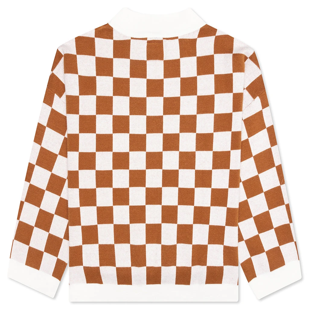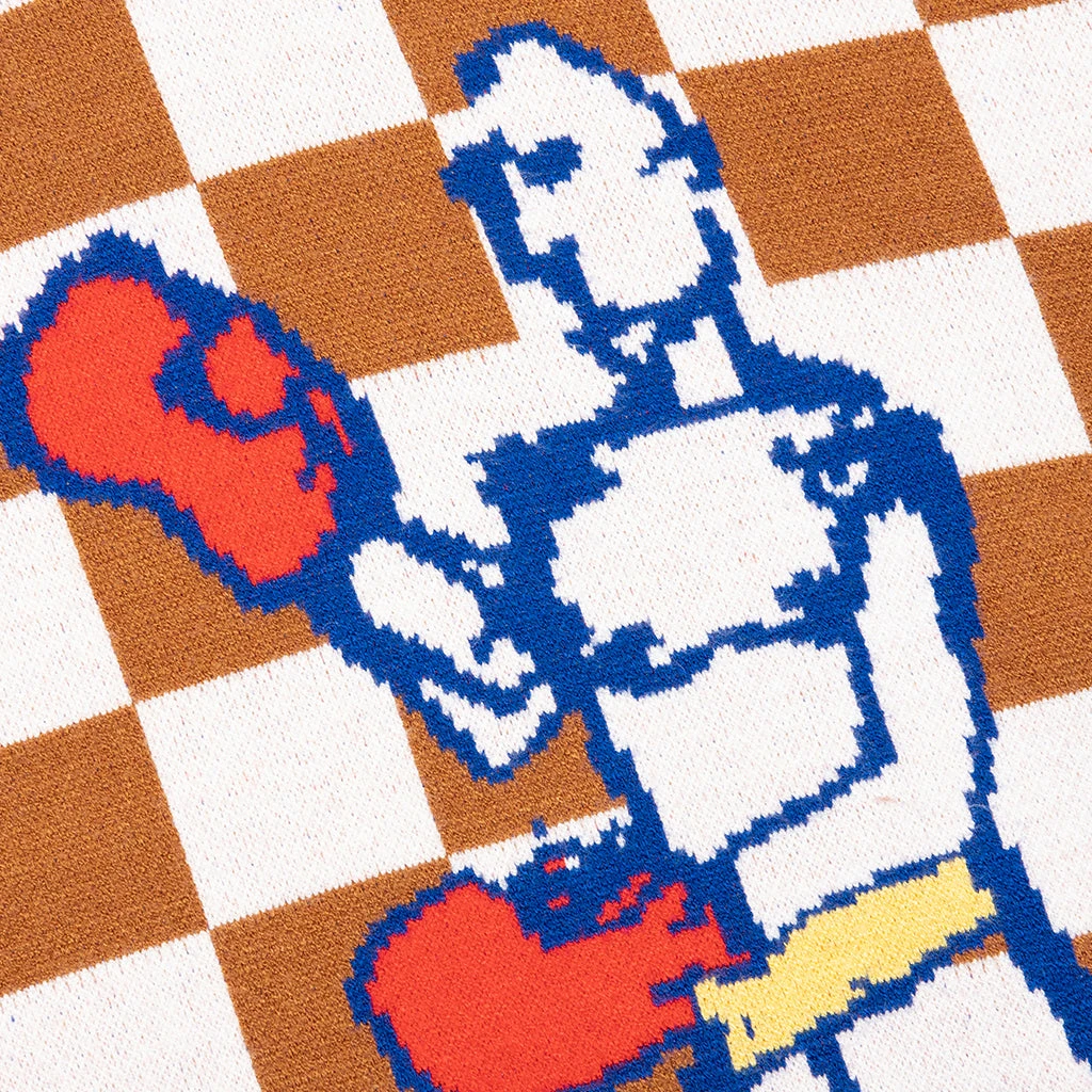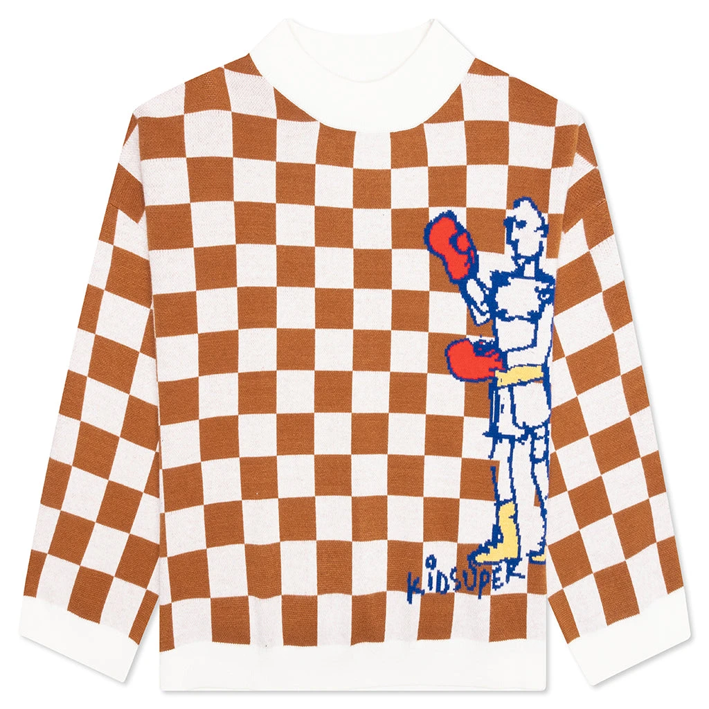 KidSuper introduces the Checkered Boxing Sweater. Composed of wool, the sweater spotlights ribbed detailing at the neckline, cuffs, and hem. The all-over stitched checkers make an impression. Branding resides at the front with additional boxing jacquard imagery.