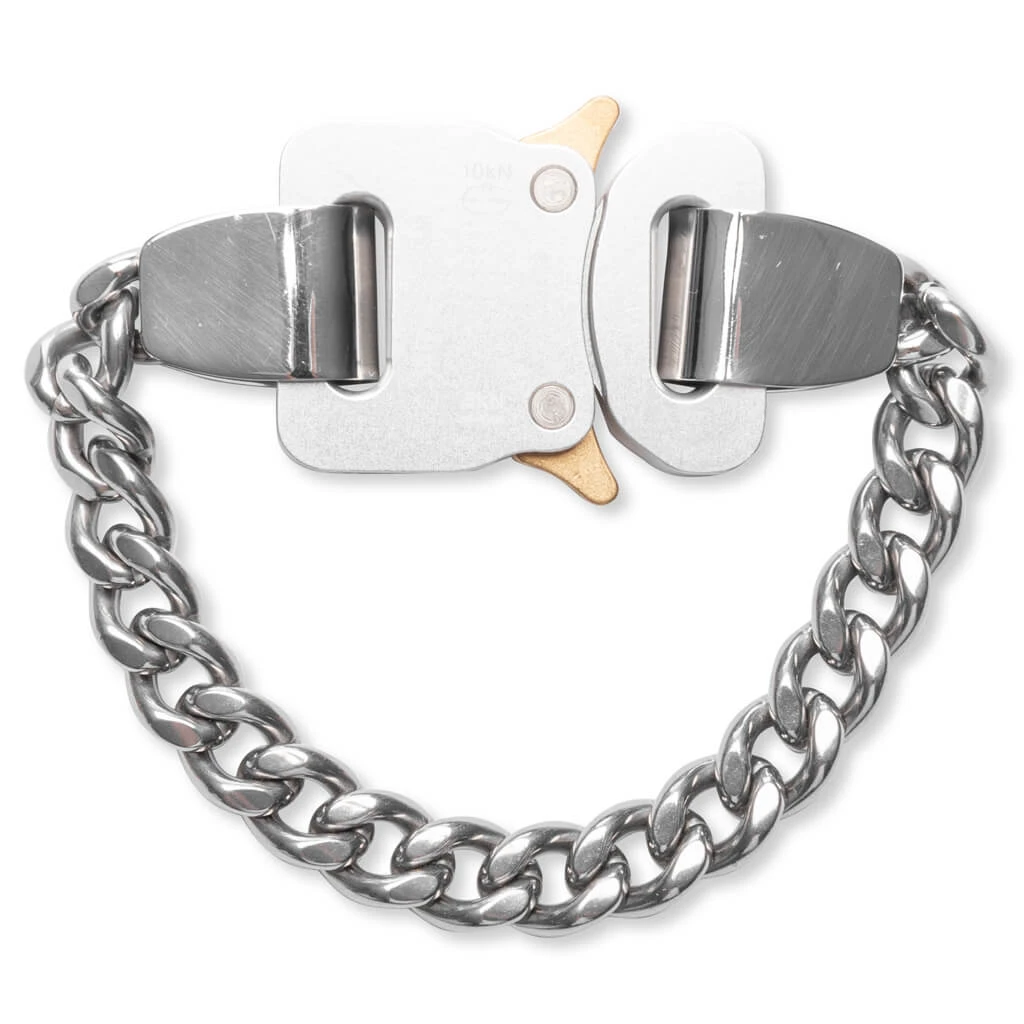 1017 Alyx 9SM introduces its Metal Buckle Bracelet. Composed of steel, the bracelet features a signature metal rollercoaster buckle composed of aluminum alloy. The chainlink design is finished with engraved branding for a finishing touch.