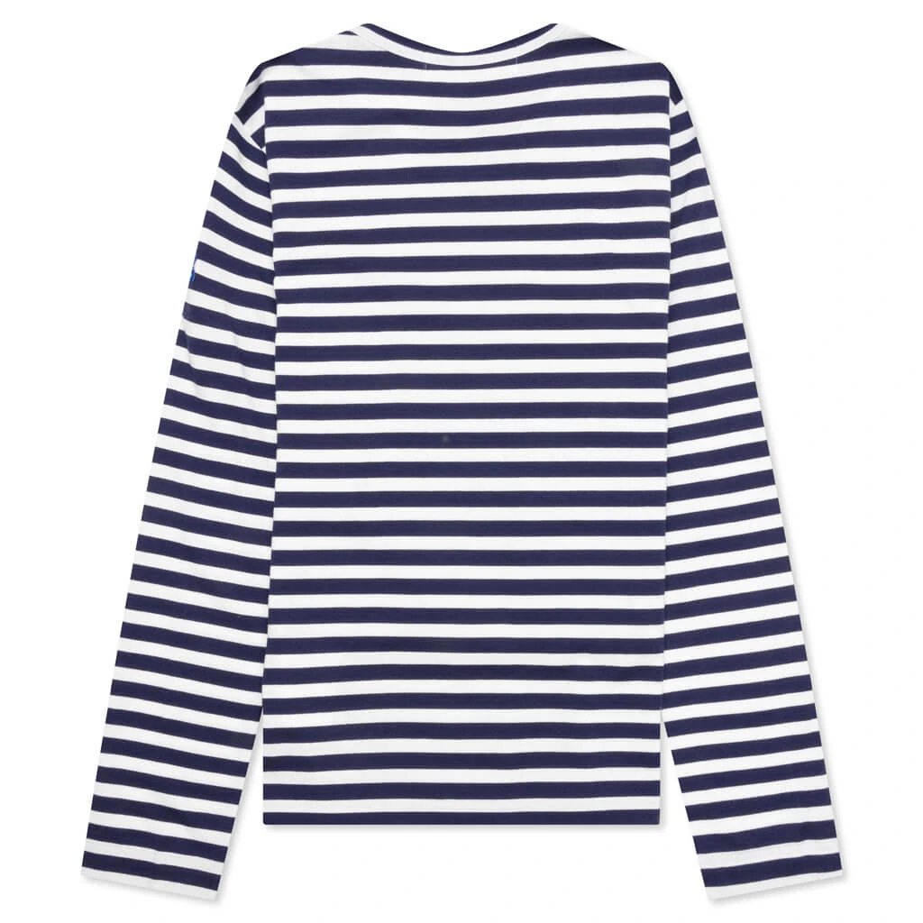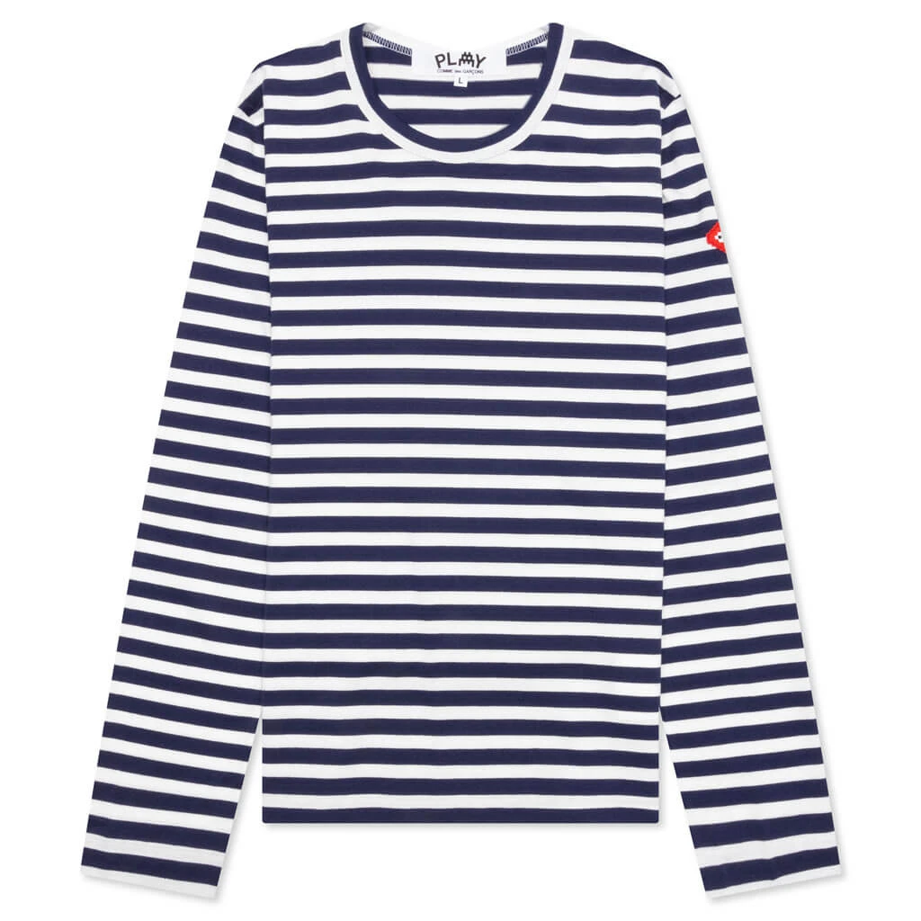 The Comme Des Garçons PLAY x The Artist Invader collection expands as they introduce the Striped long sleeve Tee. Composed of 100% cotton, the design has horizontal stripes throughout, and the signature embroidered pixelated red heart motif is placed on the sleeve. A crew neckline and straight hem wrap up the look.