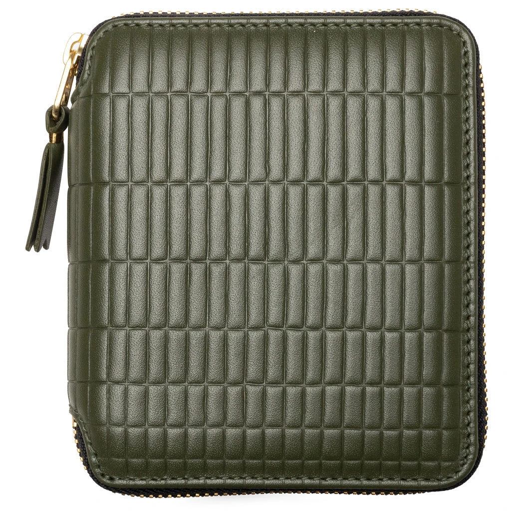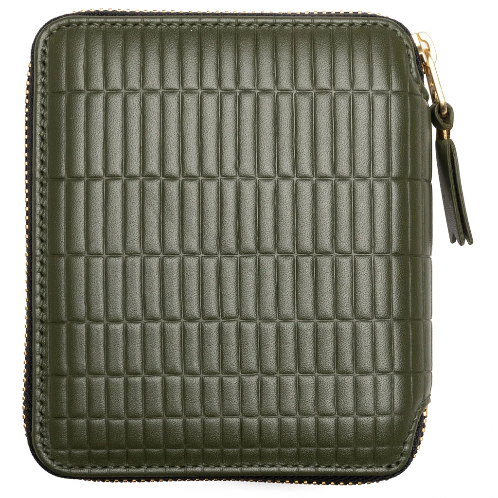 Customizing an everyday accessory and transforming it into Comme des Garçons’ aesthetic can be found within the Brick Line Wallet. The khaki brick pattern is found throughout the piece and is accented with gold hardware. Made out of 100% leather the inside consists of compartments and an embossed logo.