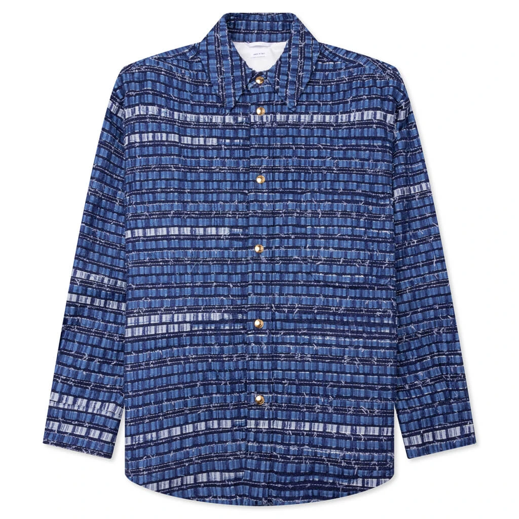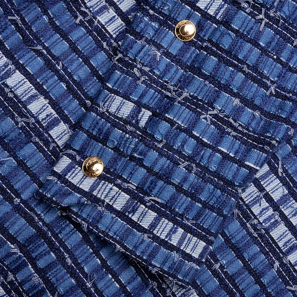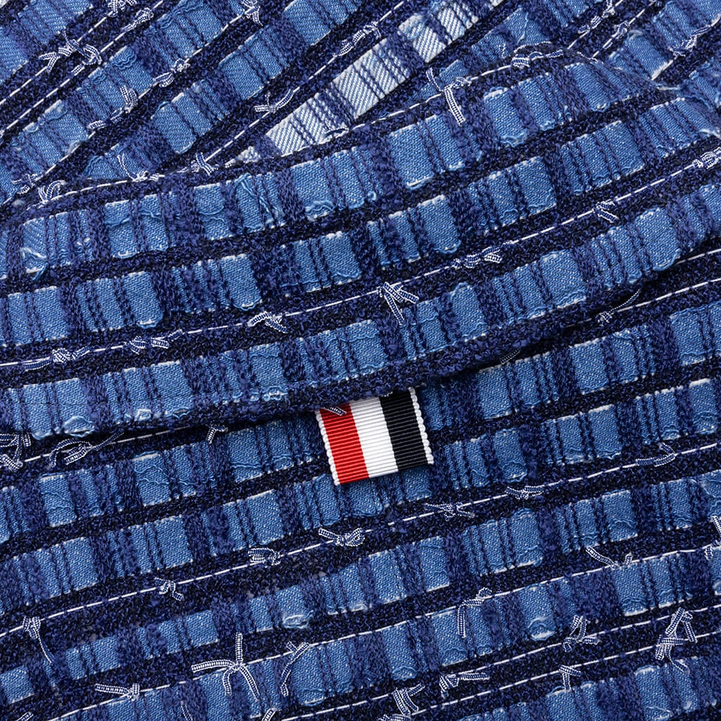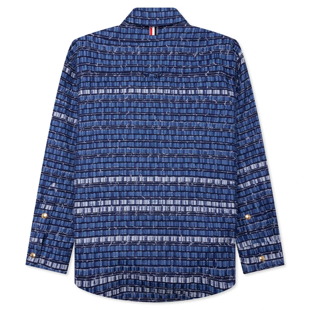 The Oversized Shirt Jacket from Thom Browne brings a bold statement with denim tweed materials. The distressed denim elevates the look and provides a layer of detail. The design features brass snap button front closure and pleated button cuffs. An interior pocket and branded nametag add to the attention to detail. The brand’s signature striped grosgrain loop tab at the back of the neck rounds out the look.