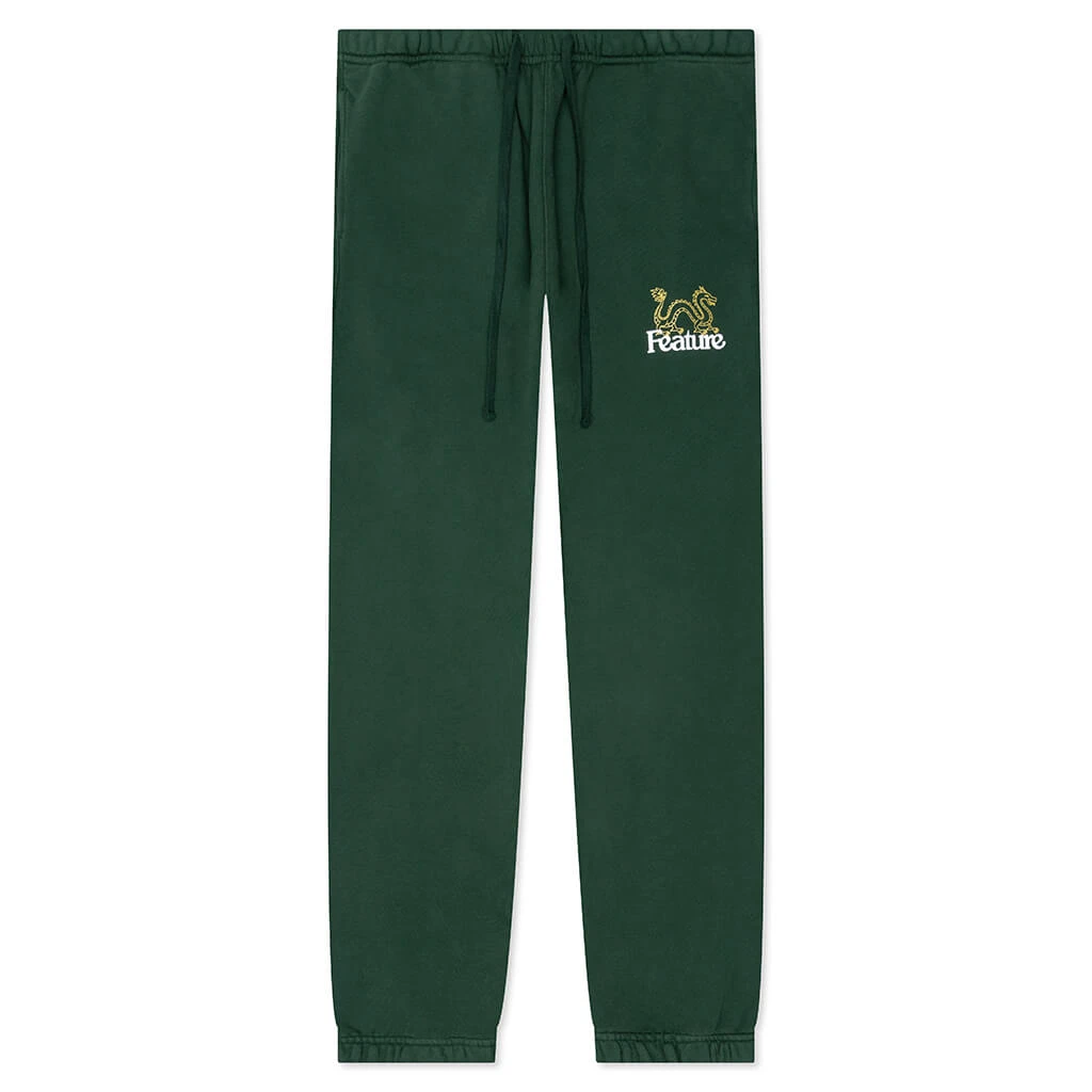Our FEATURE Chapter Capsule includes our FEATURE Dragon Sweatpants in dark green. This design nods to our brand’s origins at our first brick-and-mortar location in Chinatown, Las Vegas. A screen-printed FEATURE logo is seen on the leg with a graphic image of a dragon. Made with a 14 oz heavyweight 220 GSM cotton construction, the sweatpants feature a stretchy ribbed waistband is placed along with matching cuffs. A drawstring is placed at the waist for added comfort, while a rear pocket and in-seam side pockets provide a functional touch.