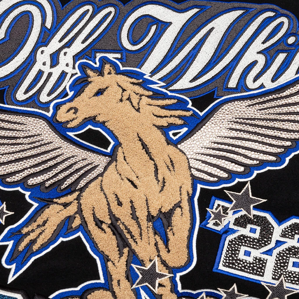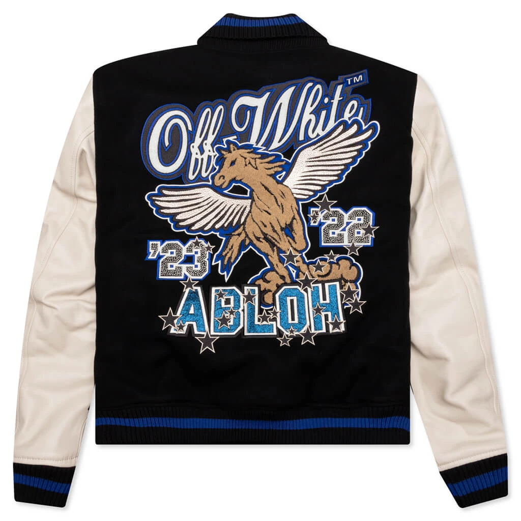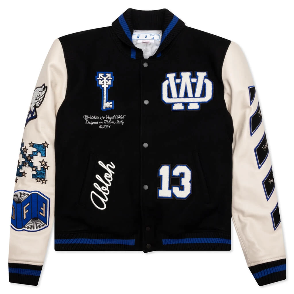 Off-White introduces the Graphics Leather Varsity as one of its latest outerwear apparel items. Composed of a wool blend, the jacket spotlights a snap button closure along with striped ribbed detailing at the trims. Embroidered branding and patchwork is scattered throughout, while the hand pockets add a functional finish to the design.