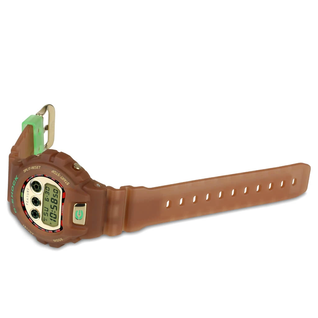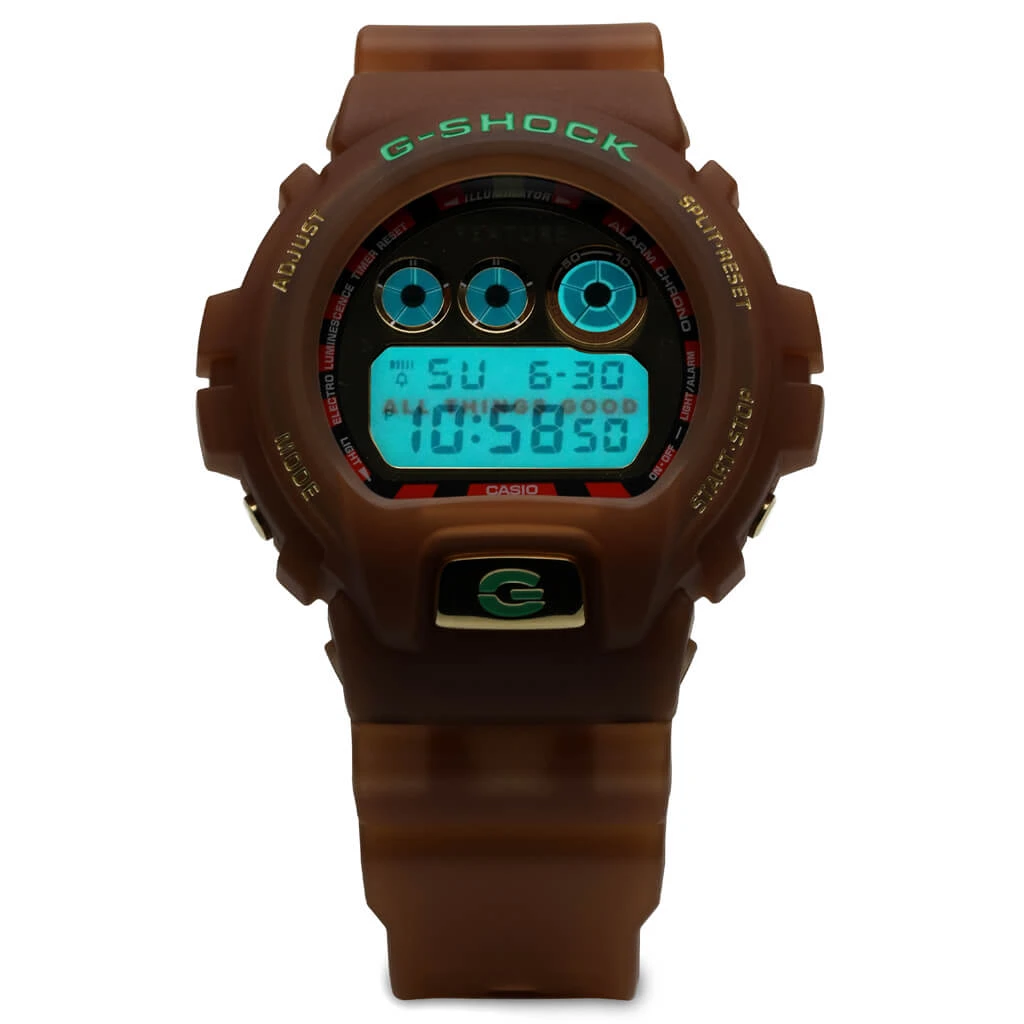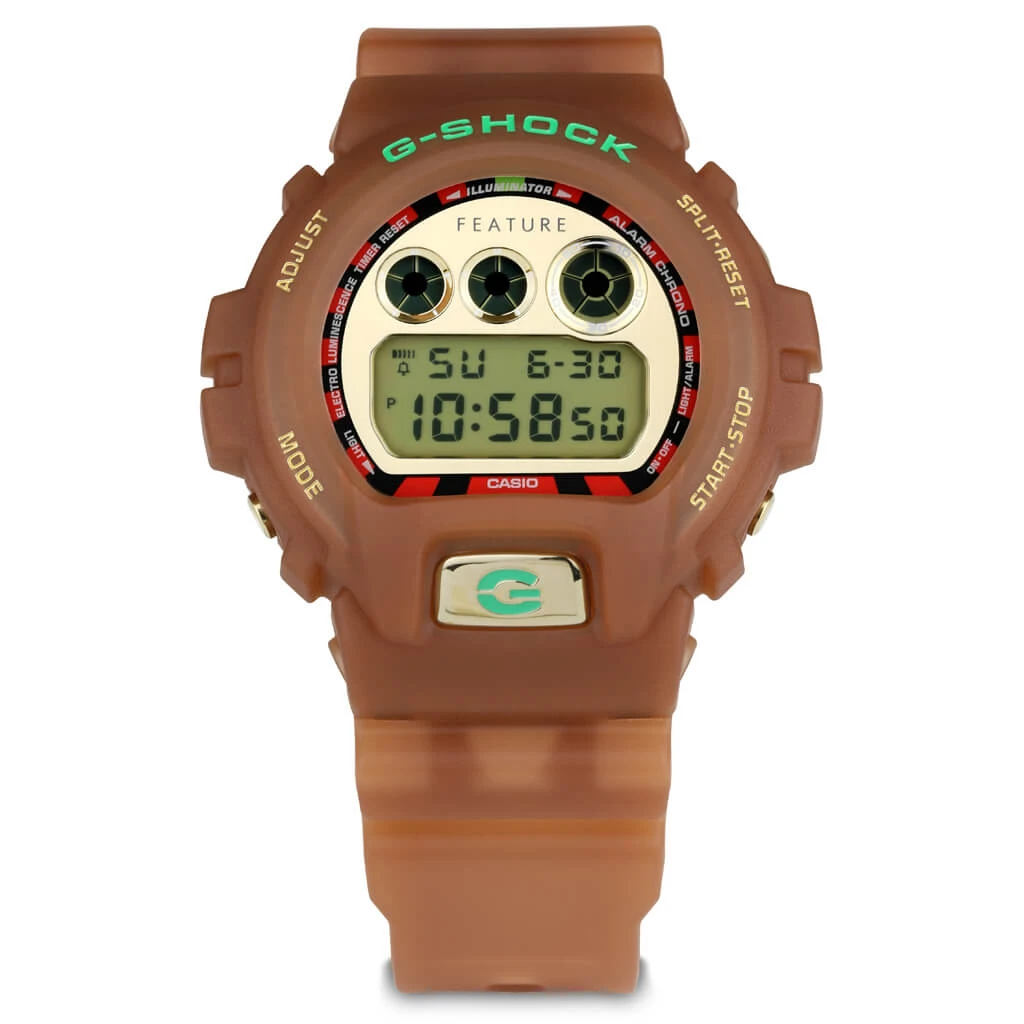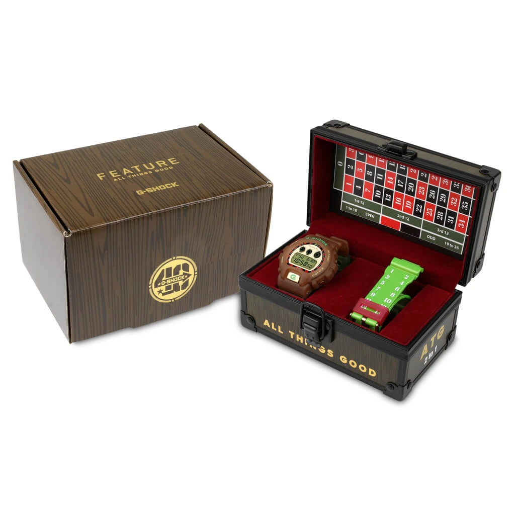Introducing our second collaborative partnership with G-Shock, the ’24HRS in Las Vegas’ watch style pays homage to Las Vegas and the feeling of spending a day in the city that never sleeps. The shock-resistant design is highlighted by the brown transparent resin case + bands. Matching gold face + crowns, with small hits of green throughout the case add dimension to the watch. The bezel features a signature red and black roulette wheel, and the adjustable brown resin band can be switched to the green resin band which has a roulette numbered print. FEATURE branding can be seen throughout the design, and a fully custom box houses the watch and its accessories.