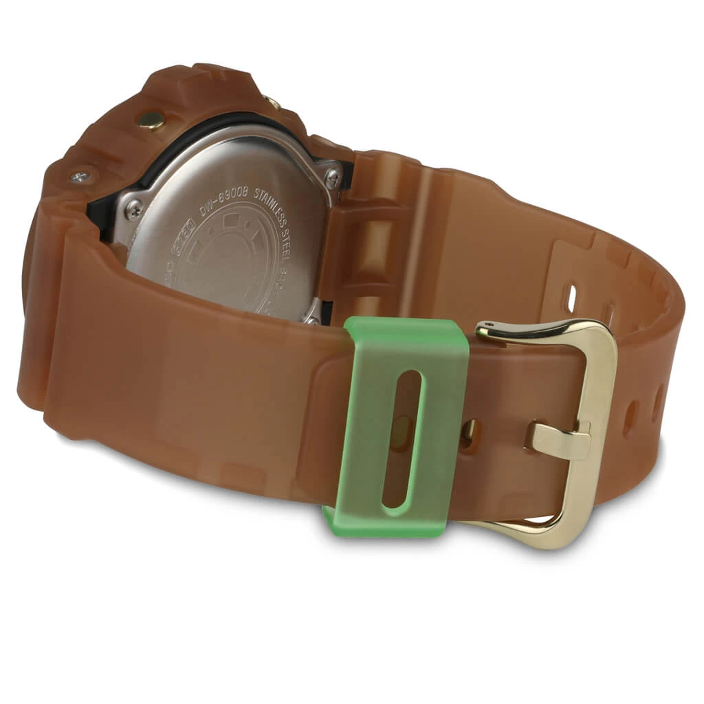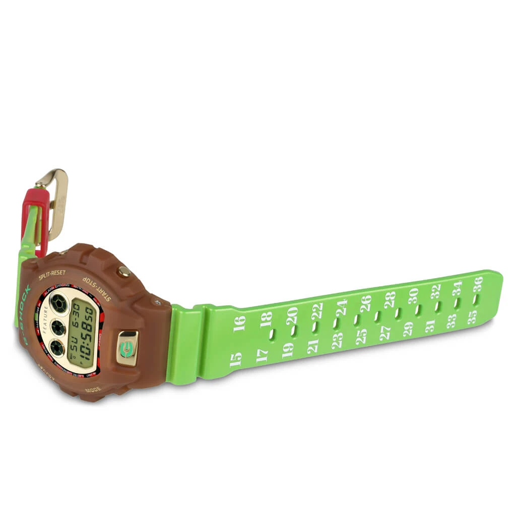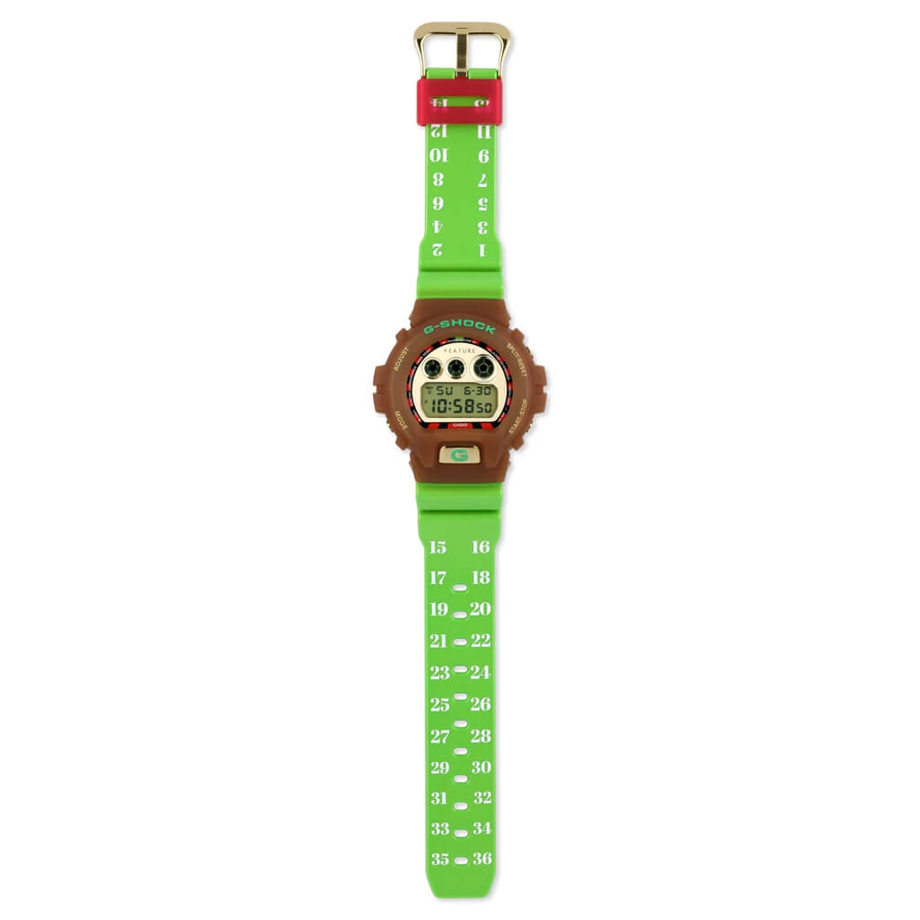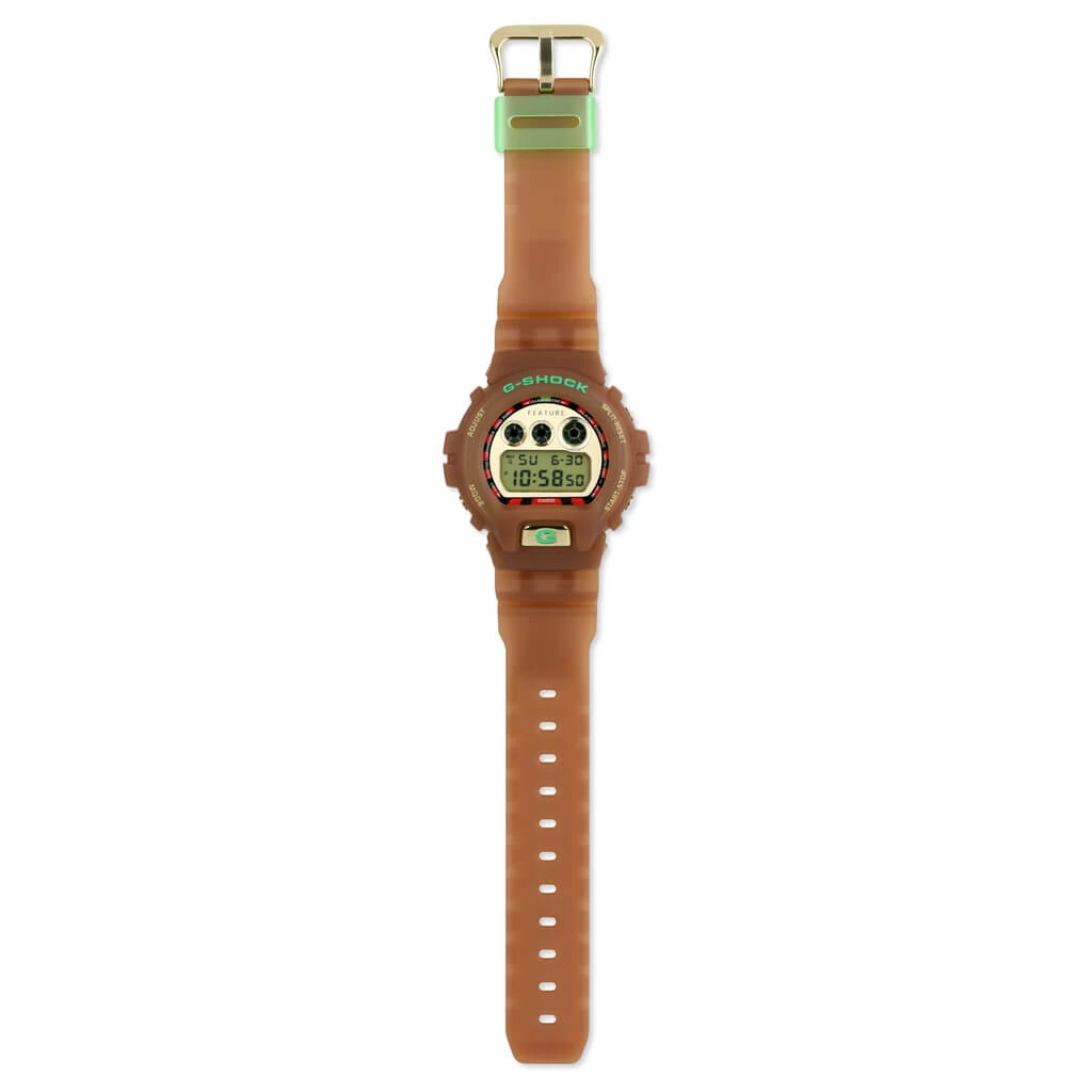 Introducing our second collaborative partnership with G-Shock, the ’24HRS in Las Vegas’ watch style pays homage to Las Vegas and the feeling of spending a day in the city that never sleeps. The shock-resistant design is highlighted by the brown transparent resin case + bands. Matching gold face + crowns, with small hits of green throughout the case add dimension to the watch. The bezel features a signature red and black roulette wheel, and the adjustable brown resin band can be switched to the green resin band which has a roulette numbered print. FEATURE branding can be seen throughout the design, and a fully custom box houses the watch and its accessories.