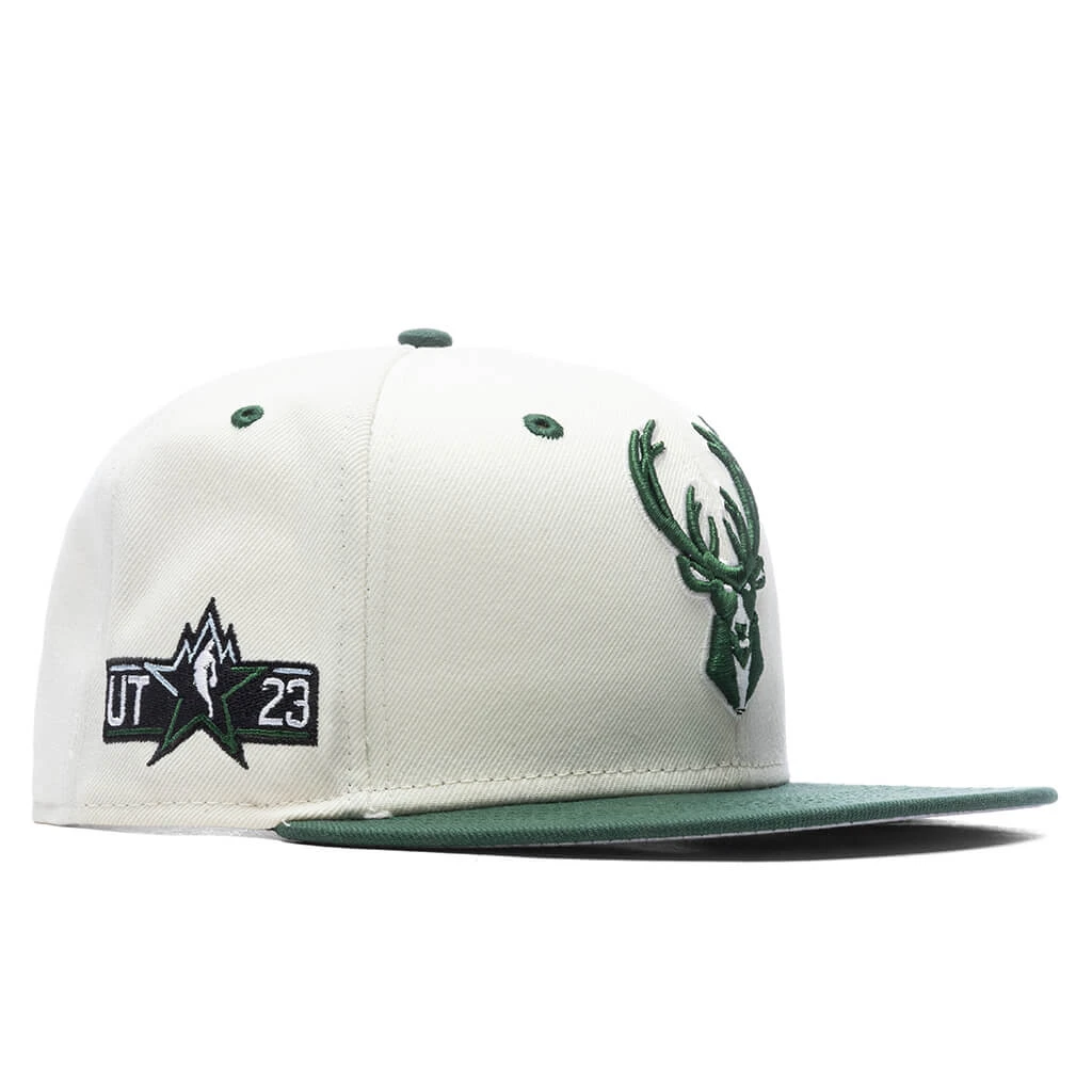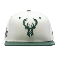 FEATURE joins New Era in spotlighting the iconic Milwaukee Bucks on the 9FIFTY Snapback. Composed of polyester, this snapback hat incorporates woven eyelets at the crown for added breathability. A contrasting flat brim is placed, while a team logo is embroidered on the face. An NBA All-Star patch can be found on the right side, while a New Era flag is seen on the left. The adjustable rear closure finishes the rest of the look.