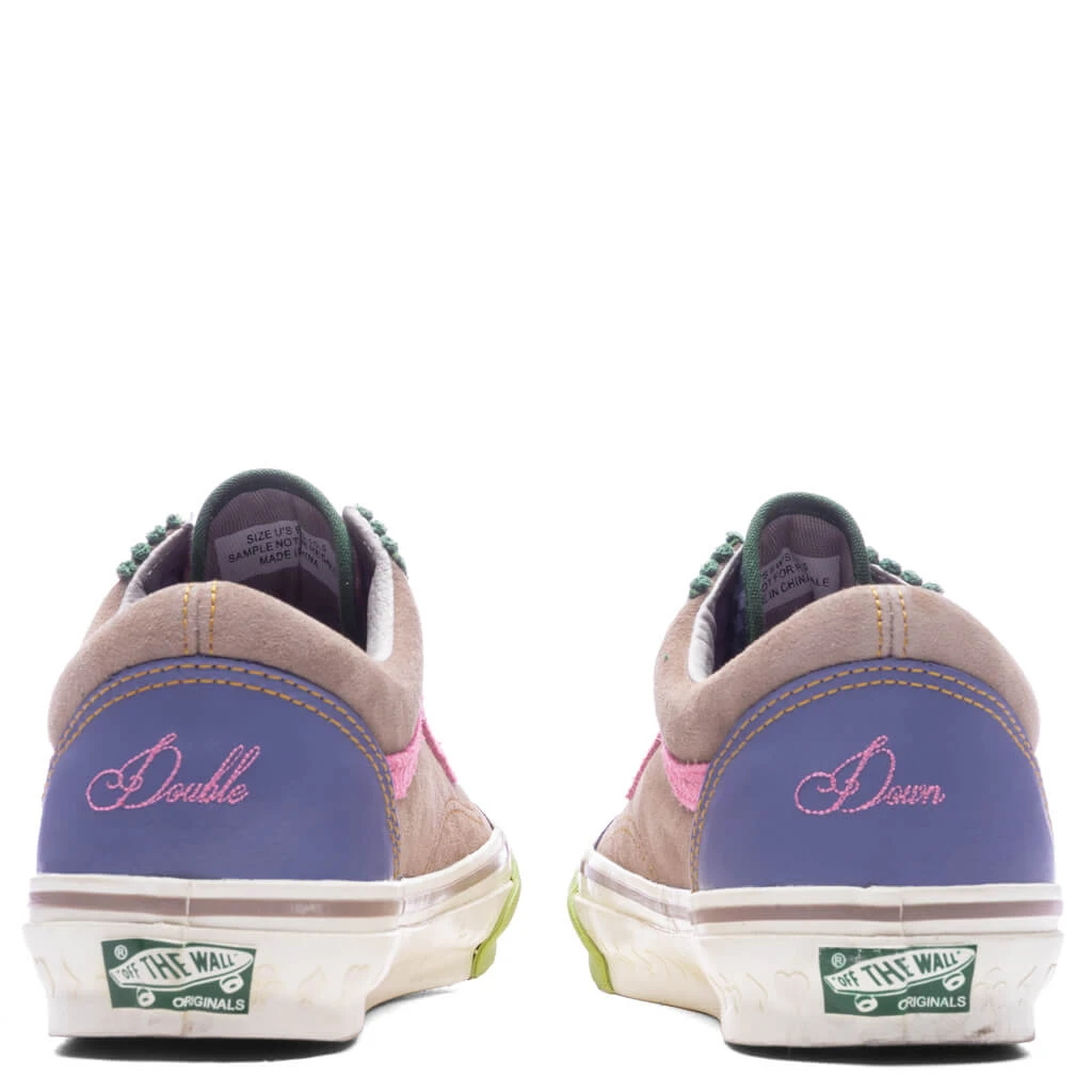 The final iteration of our ongoing FEATURE x Vans Vault ‘Sinner’s Club’ collaboration concludes with the FEATURE x Vans Vault ‘Double Down Sinner’s Club.’ Consisting of an Authentic + Old Skool sneaker, the Old Skool starts with a nubuck upper and leather toe box. Both canvas tongues are treated with contrasting checkerboard prints, while the signature ‘Double Down’ embroidery can be found at the heels. Shaggy suede resides at the signature Old Skools side stripe, while the laces’ canvas lining and thick corduroy offer further detailing. Tonal stitching is placed throughout. The screen-printed graphic insoles and the debossed vulcanized midsole provide additional references to vintage Las Vegas. Three sets of cotton laces paired with the rubber waffle outsole underneath complete the overall silhouette.