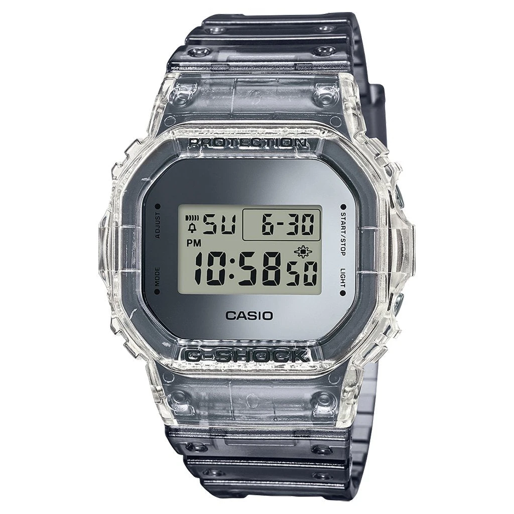 G-Shock is a line of watches manufactured by Casio, designed to resist mechanical shock and vibration. Born at a time when watches were generally considered fragile instruments, G-SHOCK began as the dream of a young engineer, who wanted to create “a watch that doesn’t break, even when dropped.” Pictured is the G-Shock DW5600SK-1 in Skelton.