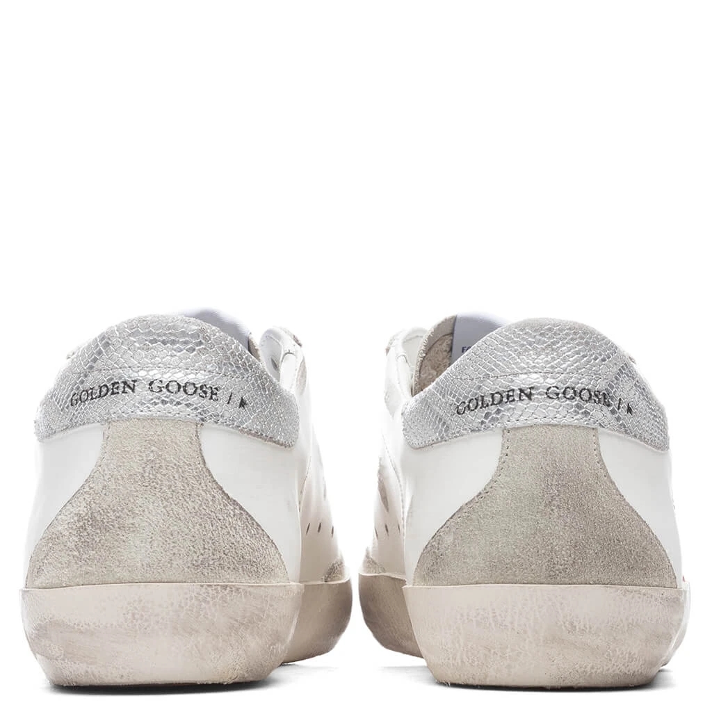 Elevate your go-to pair of sneakers with the latest rendition of the Golden Goose Women’s Super-Star. Featuring a leather and suede upper, this signature design spotlights a lace-up front with logo detailing placed throughout. Perforated sides make an appearance, while the lining consists of a blend of leather and terrycloth. A signature star patch makes its way to the side, while the snake-embossed metallic leather back counter. Intentional distressing are placed throughout, while the rubber outsole completes the design.