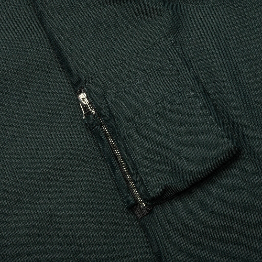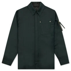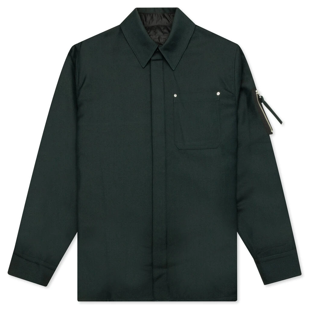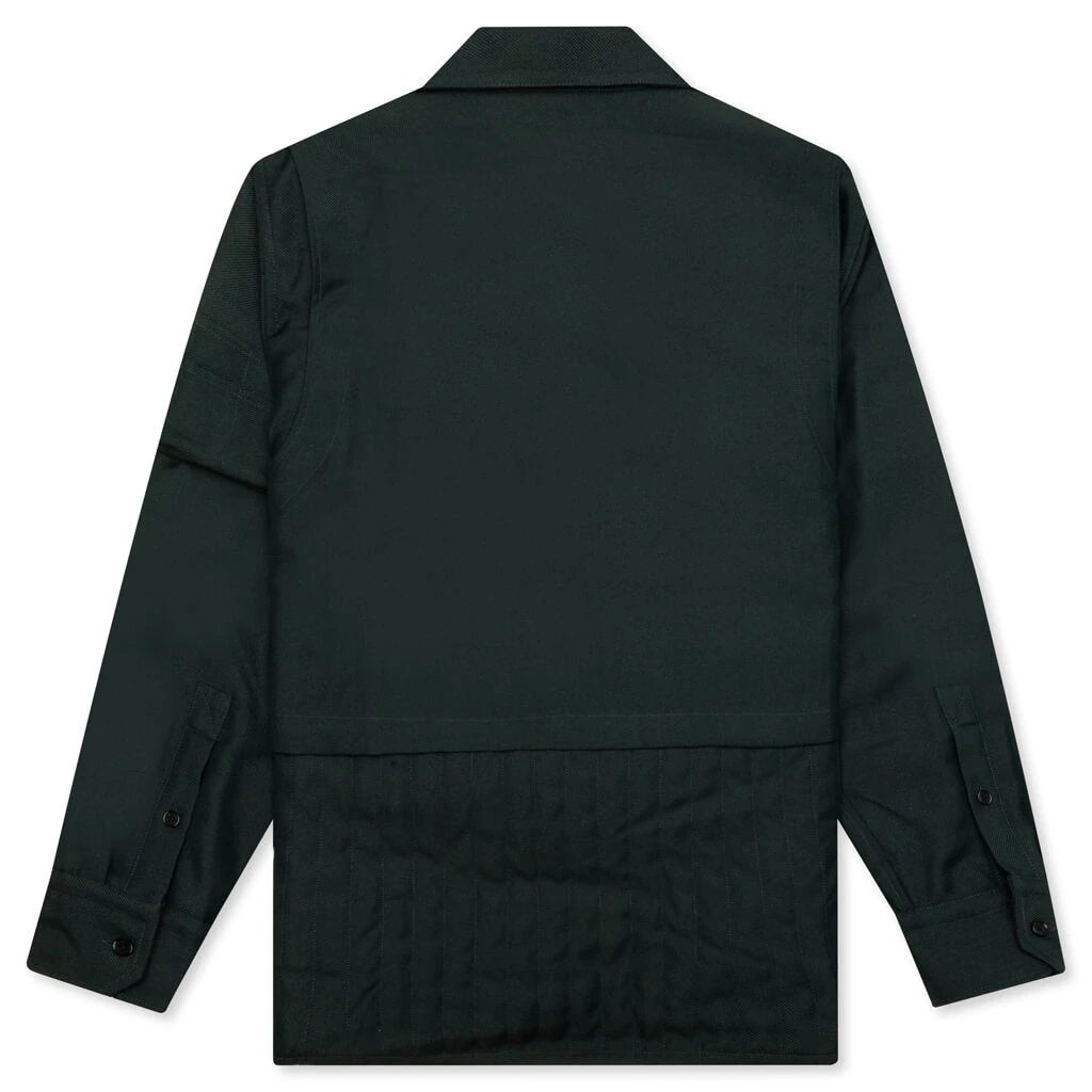 Elevate your wardrobe with Helmut Lang’s Yarndye Jacket in Evergreen. This luxury garment is crafted with a wool and polyester blend and features a pointed collar, a patch pocket at the chest + a zip pocket on the sleeve. Extra details include front button closures as well as button cuffs, and a quilted back panel.