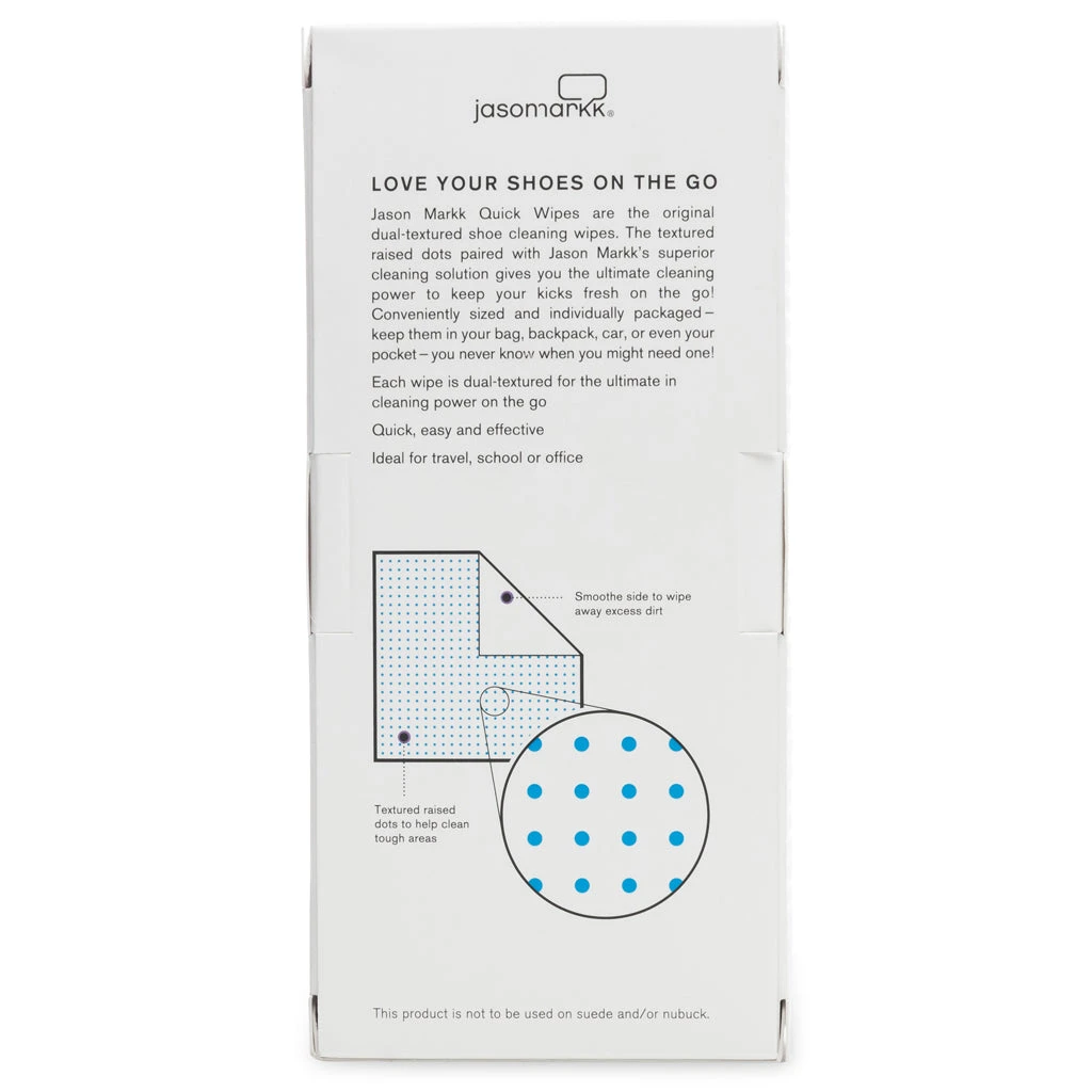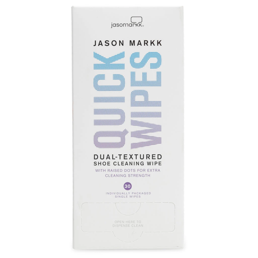 Jason Markk makes premium goods and accessories for the sneaker market. Their goal is to fulfill the needs and wants of today’s sneaker consumer by offering innovative, high-quality products and accessories. Jason Markk’s mission is to become the most widely recognized and trusted sneaker product and accessory brand in the world. Jason Markk Quick Wipes come individually packaged making it convenient to have a couple on you at all times. Each wipe is dual-textured for the ultimate in cleaning versatility on the go. One side of the wipe contains small blue dots which offers a slight abrasiveness and comes in handy when working out tougher stains – while the softer white side is great for general cleaning. Pictured is the Jason Markk Quick Wipes 30 Pack.