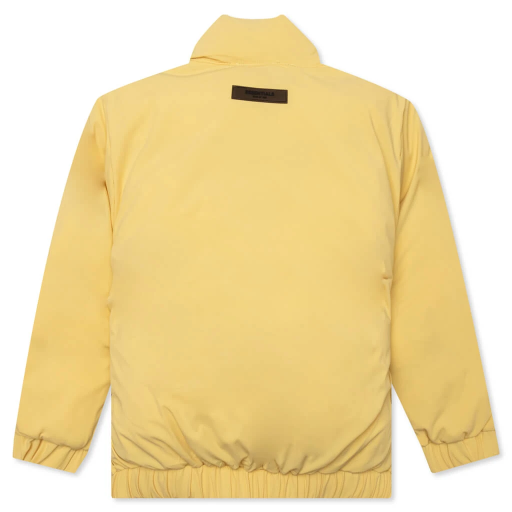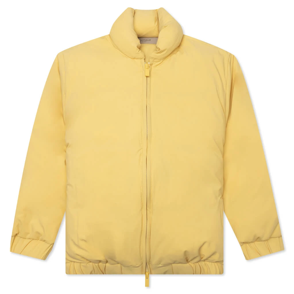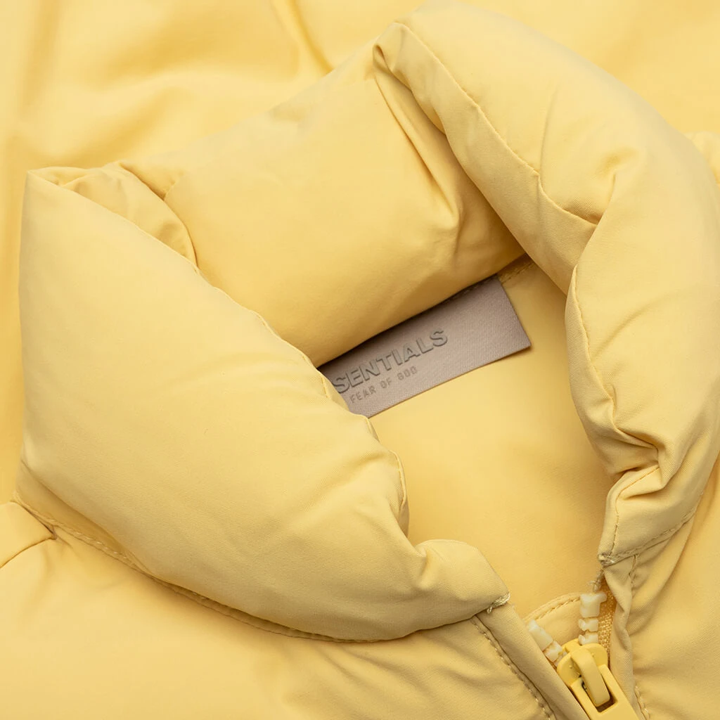 The Fear of God Essentials Kid’s Puffer makes a statement in any outerwear rotation. Composed of nylon and spandex, the silhouette features a rubberized label and a stand-up collar. Elastic cuffs and hem makes a statement, while the slash pockets tie together the rest of the design.