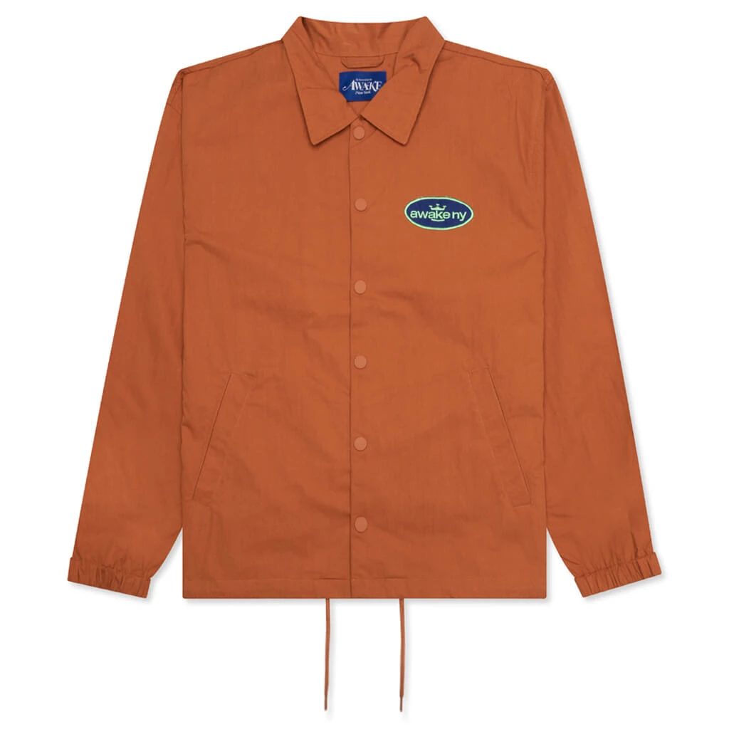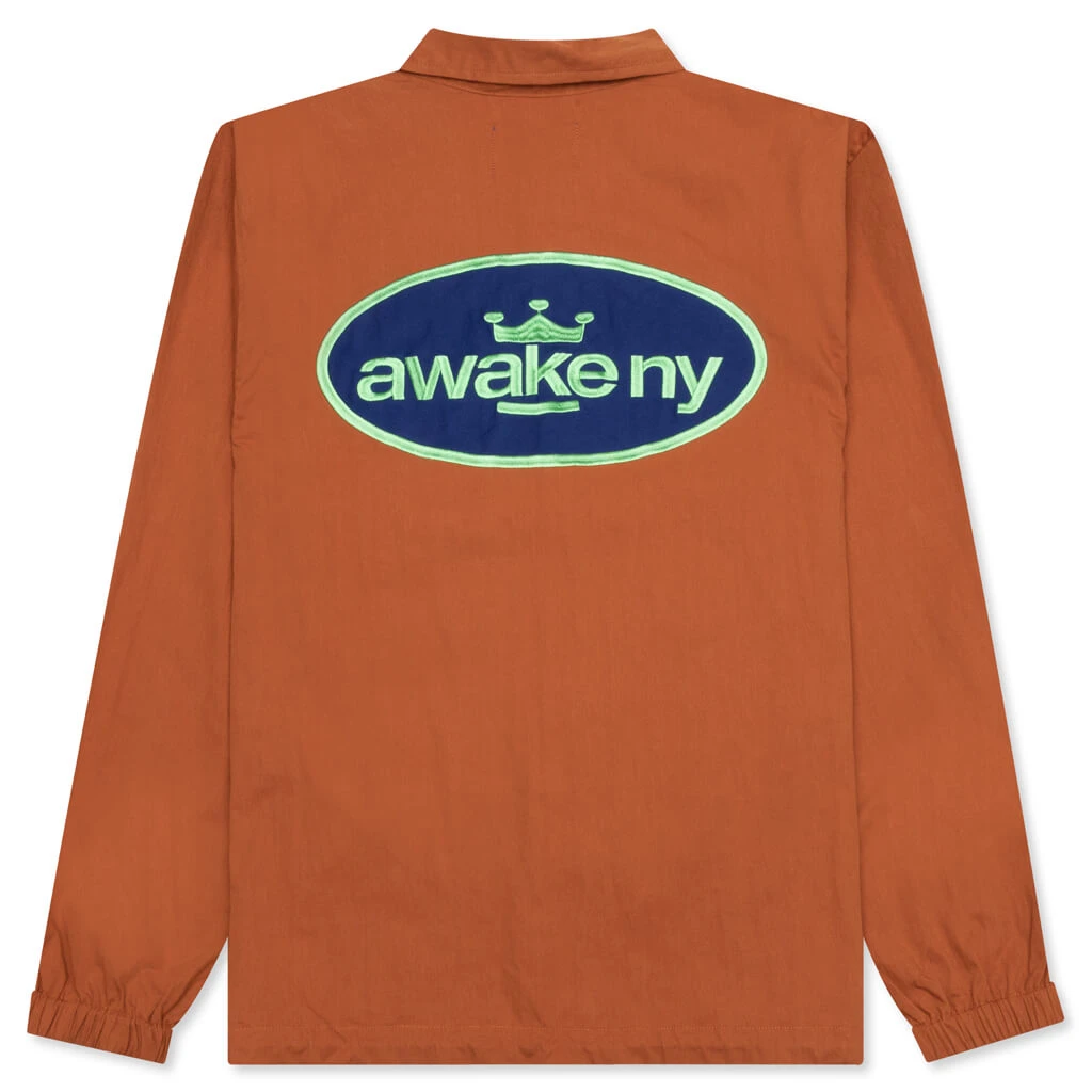 Composed of lightweight cotton twill, the Awake NY King Logo Twill Coaches Jacket makes an impression with its button closure and embroidered king logo patches at the front and rear. The pointed collar, cinched cuffs, and drawstring hem wrap up the remainder of the design.