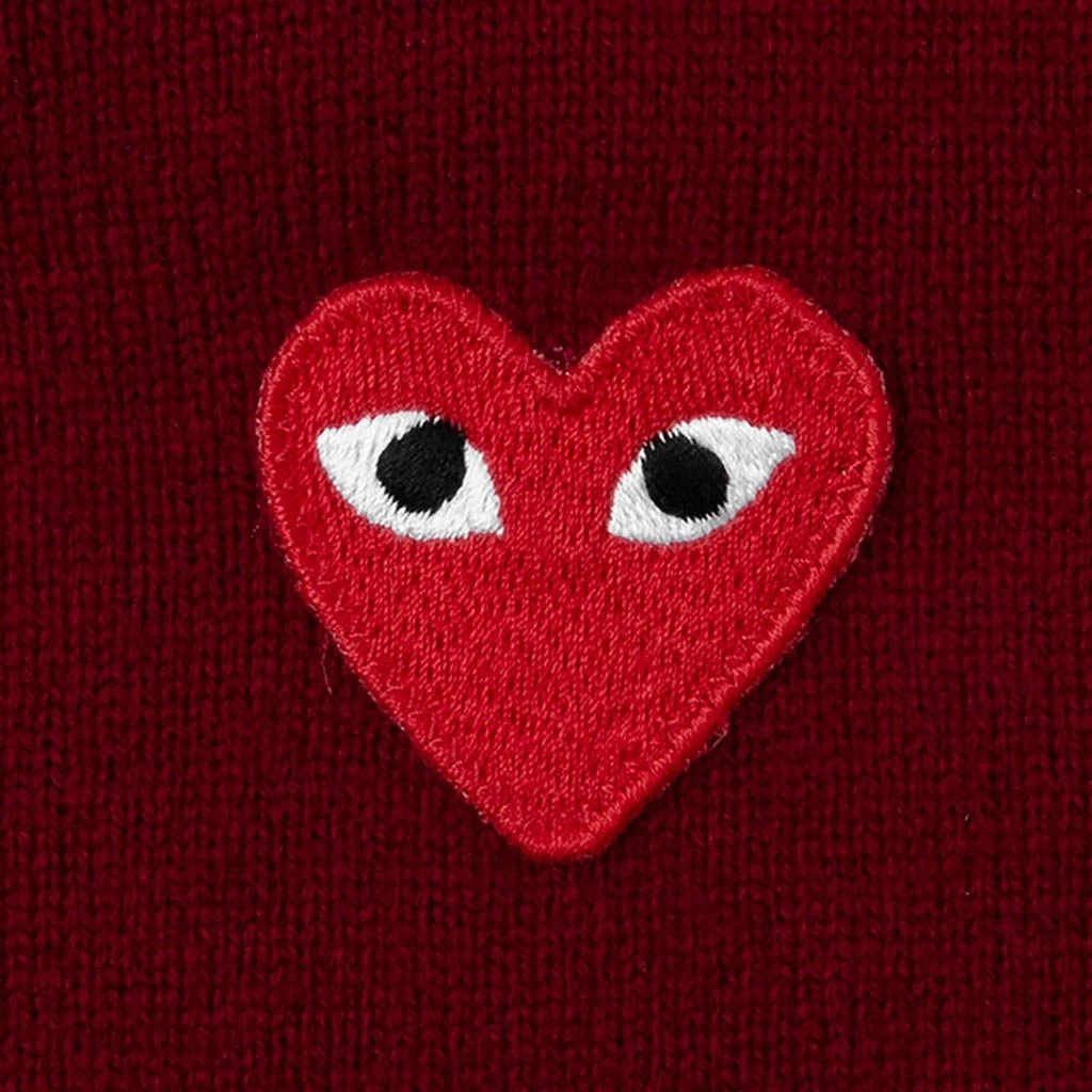 The concept of the Comme des Garcons PLAY line is design by not designing. Characterized by the iconic red heart logo designed by artist Filip Pagowski, the line is a collection of unisex basics, fragrances, and footwear for those who enjoy simplicity. Pictured is the Comme des Garcons PLAY Knit Cardigan in Burgundy.