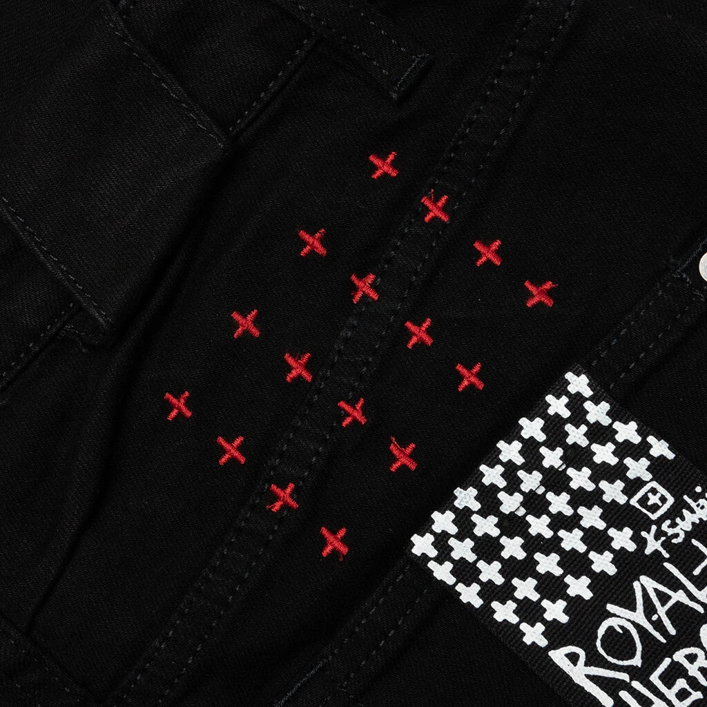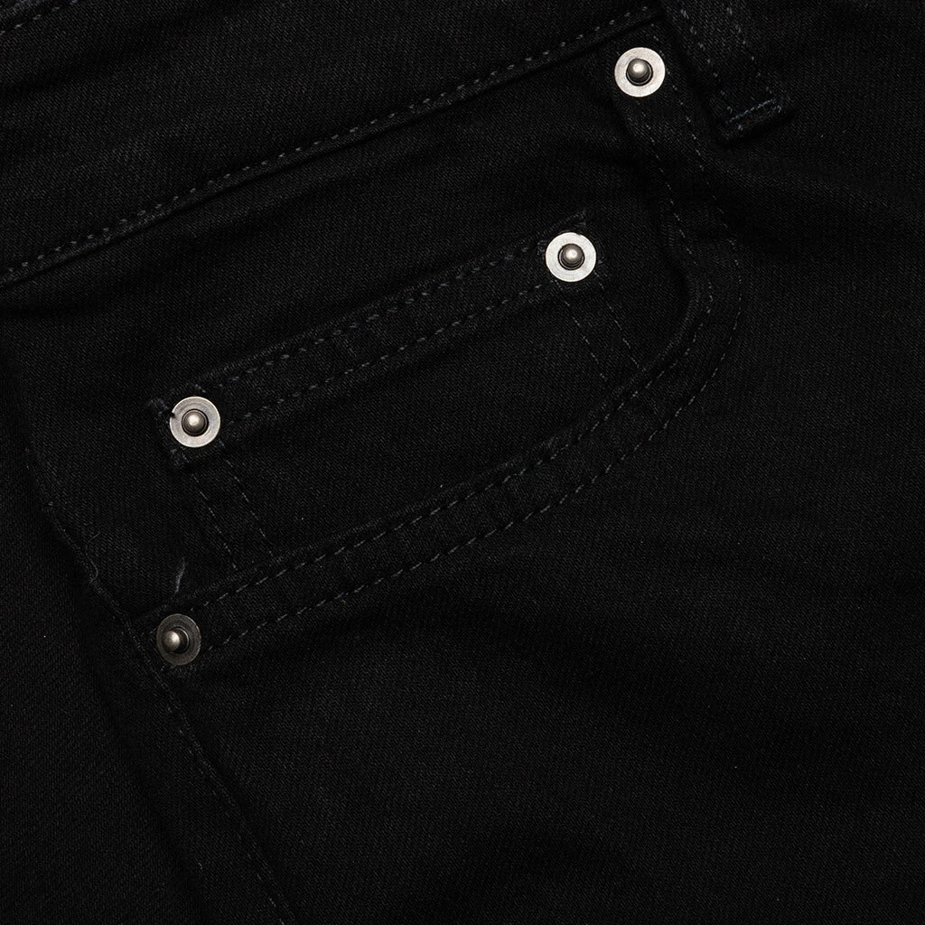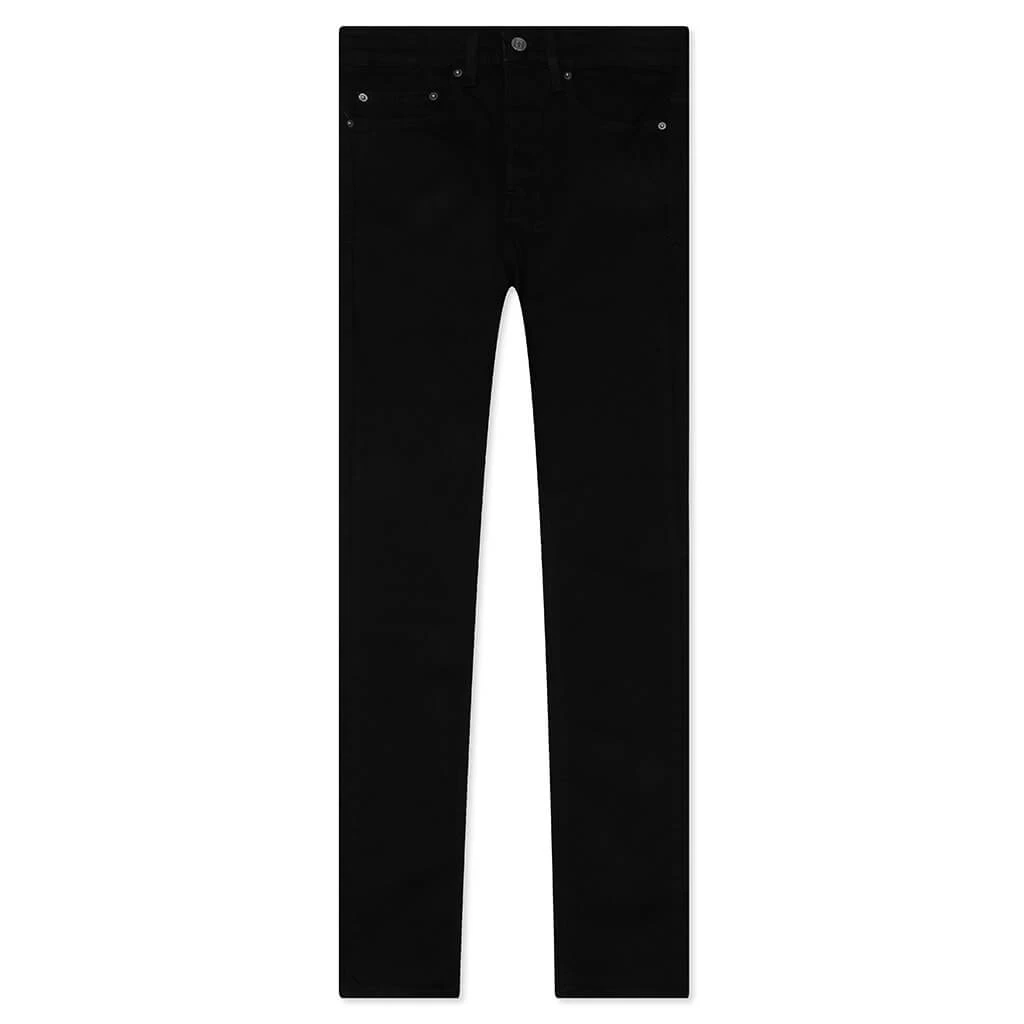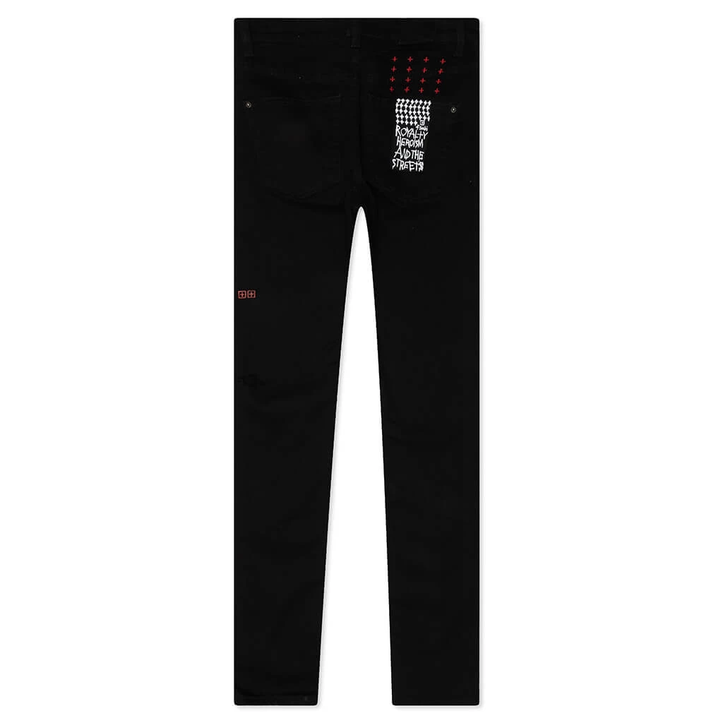 This Ksubi Chitch black jean features a tapered leg in premium stretch denim, scored at the knees, and finished with Ksubi jeans’ signature cross embroidery. Pictured is the Ksubi Chitch Jean in Laid Black.