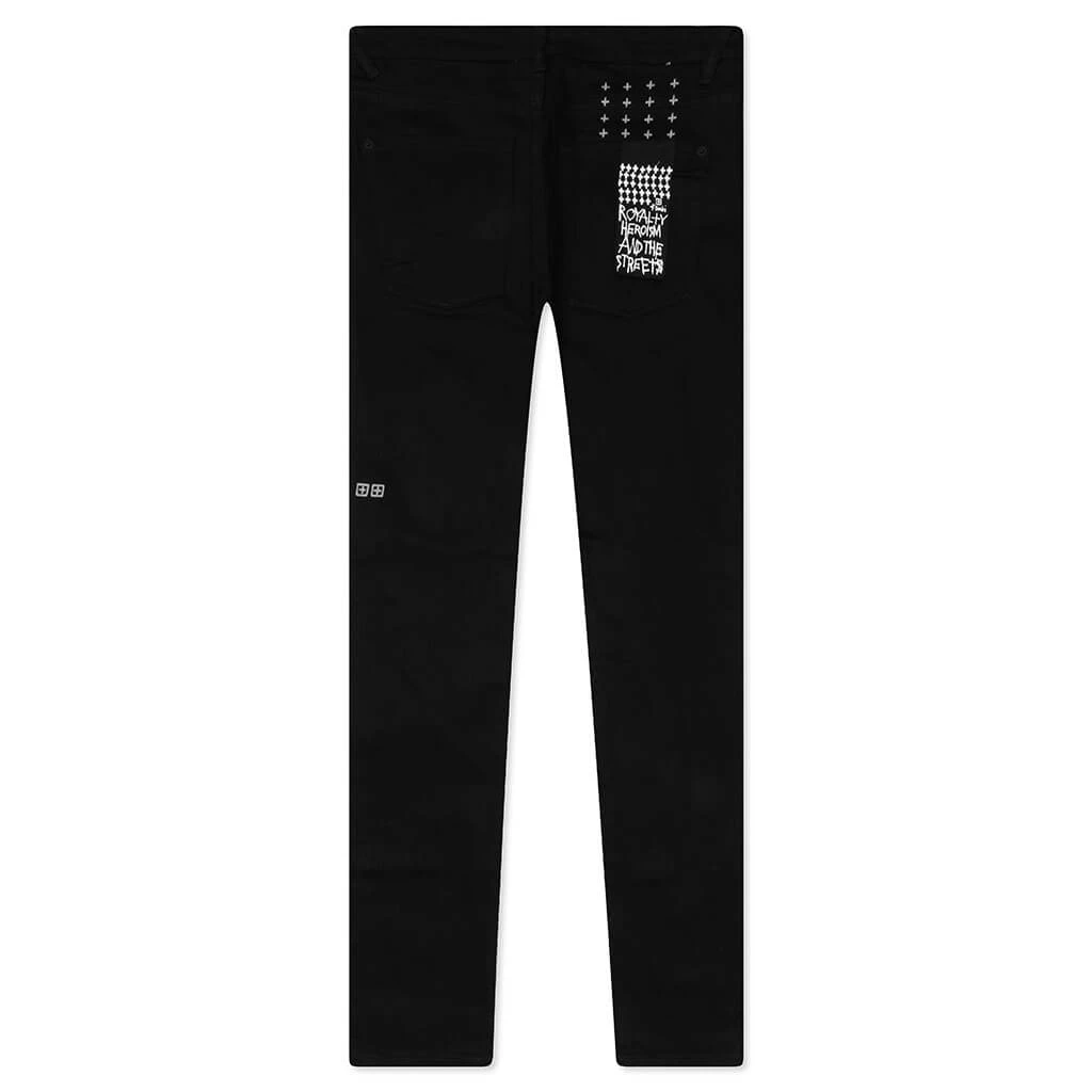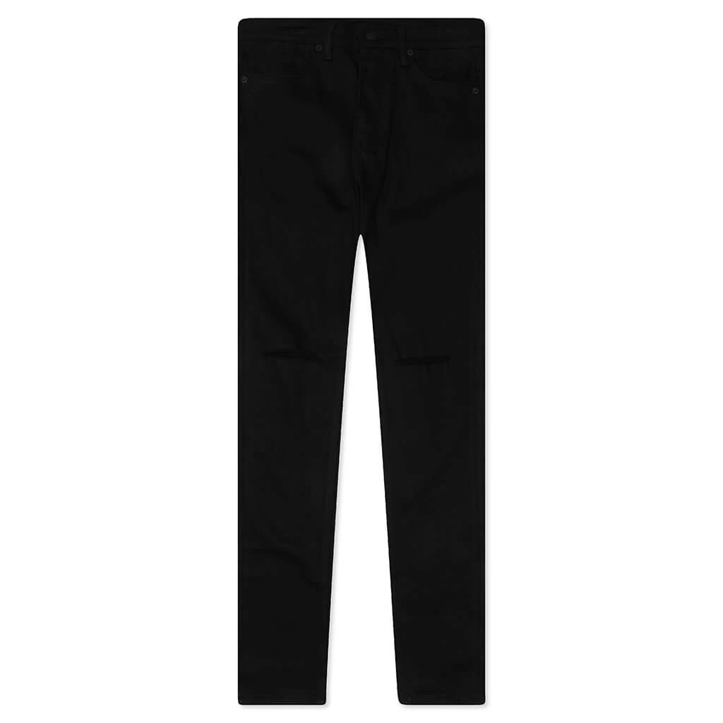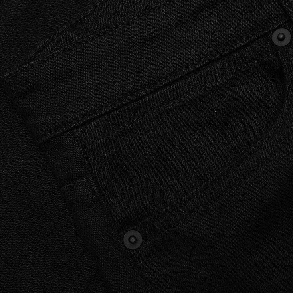 The Van Winkle jean is a skinny fit denim from thigh to ankle featuring a shorter rise. The pure black jeans are constructed using premium stretch denim and detailed stitching. Ksubi’s signature cross embroidery and tag are displayed on the backside of the silhouette.