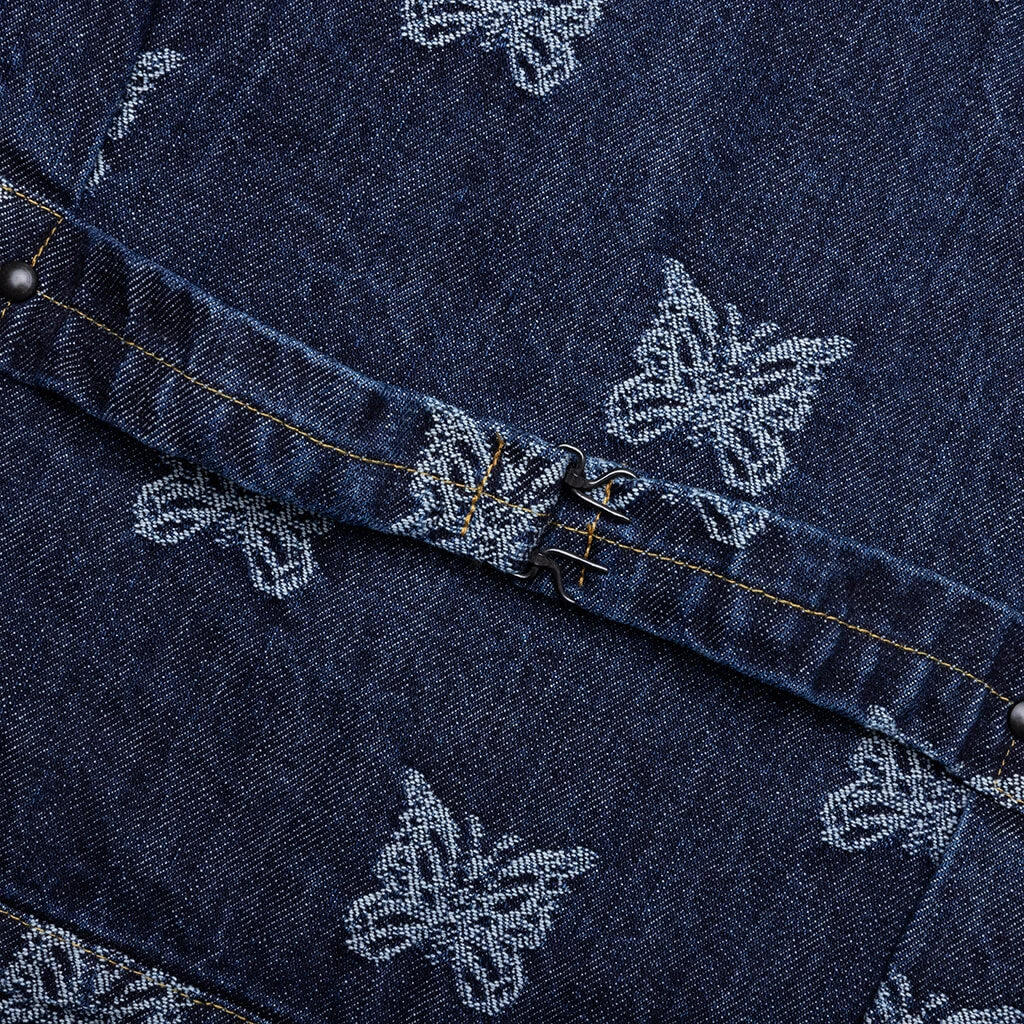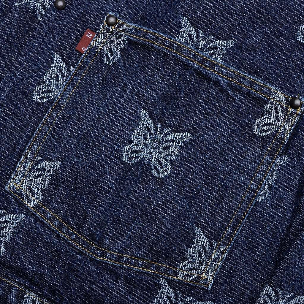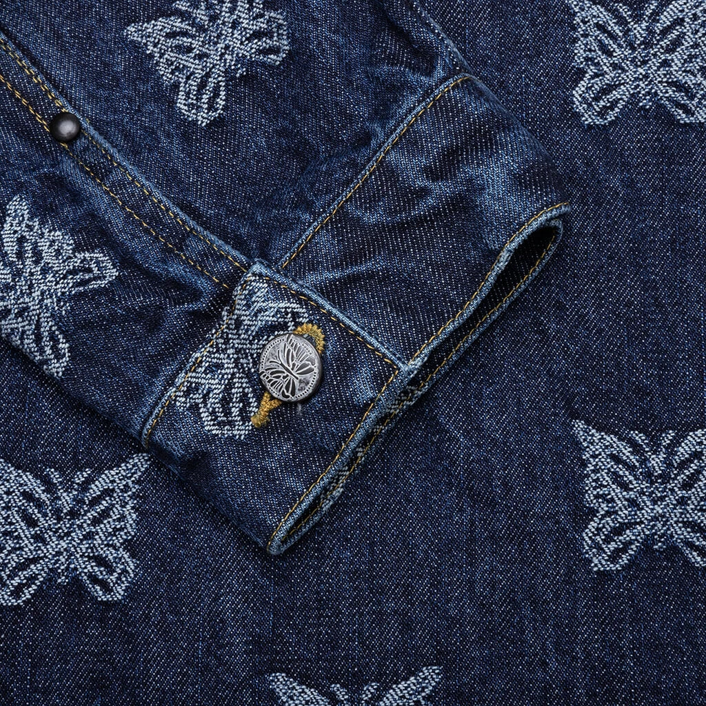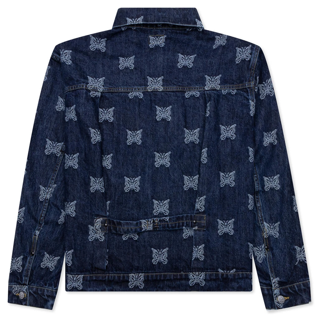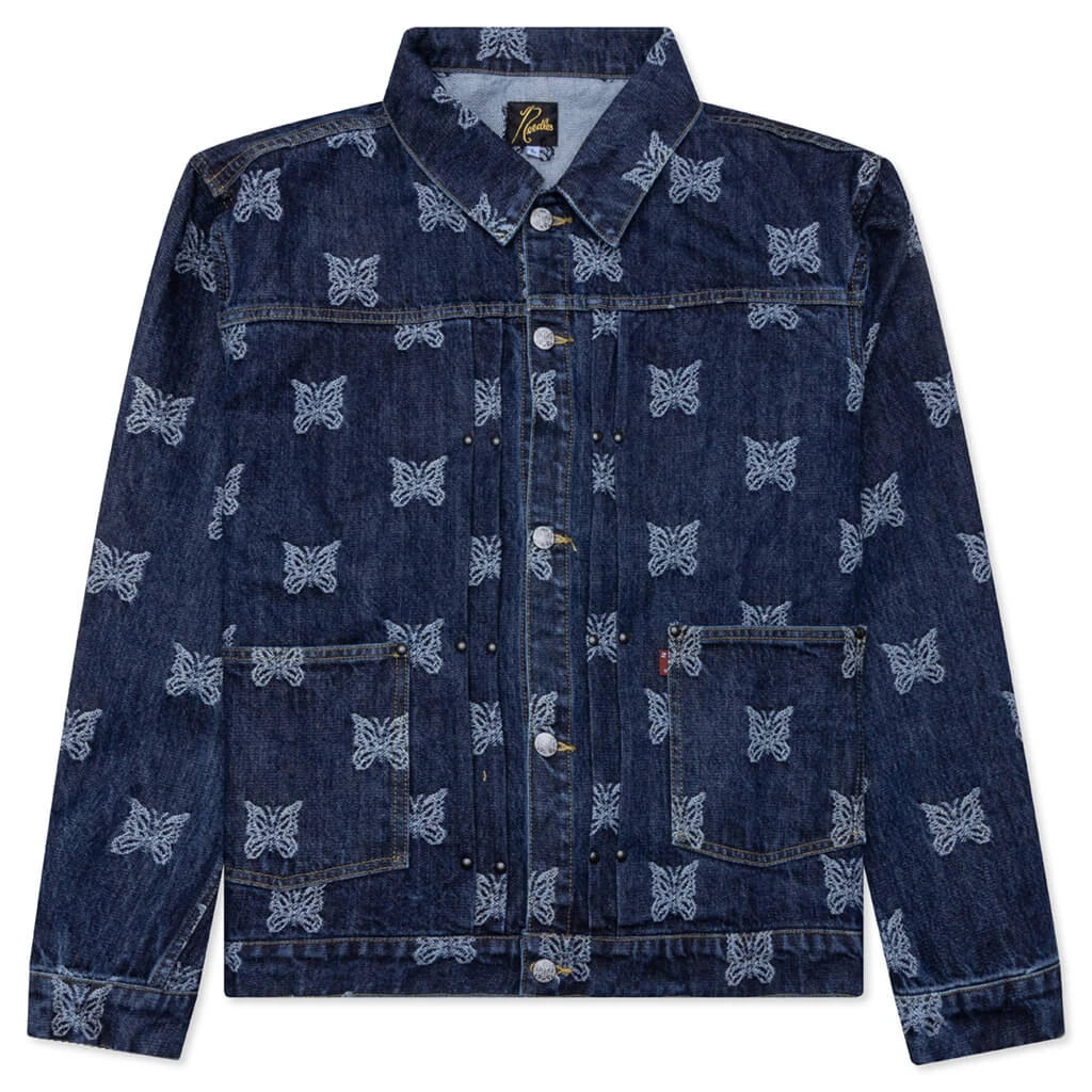 Needles introduces the M.W. Jean Jacket Papillon JQ. This cotton-cut jacket is made from a unique papillon jacquard material. The silhouette features front pockets along with a button-up closure and a pointed collar. The cinch back finishes the design.