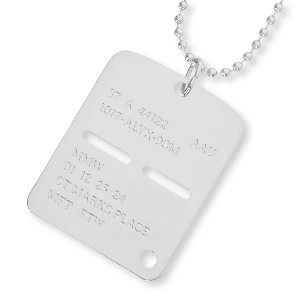 Elevate your jewelry collection with the Military Tag from 1017 Alyx 9SM. This streetwear jewelry silhouette features a complete brass construction. Presented in a shiny silver finish, the design is secured with a clasp closure and spotlights engraved branding in the tag itself.