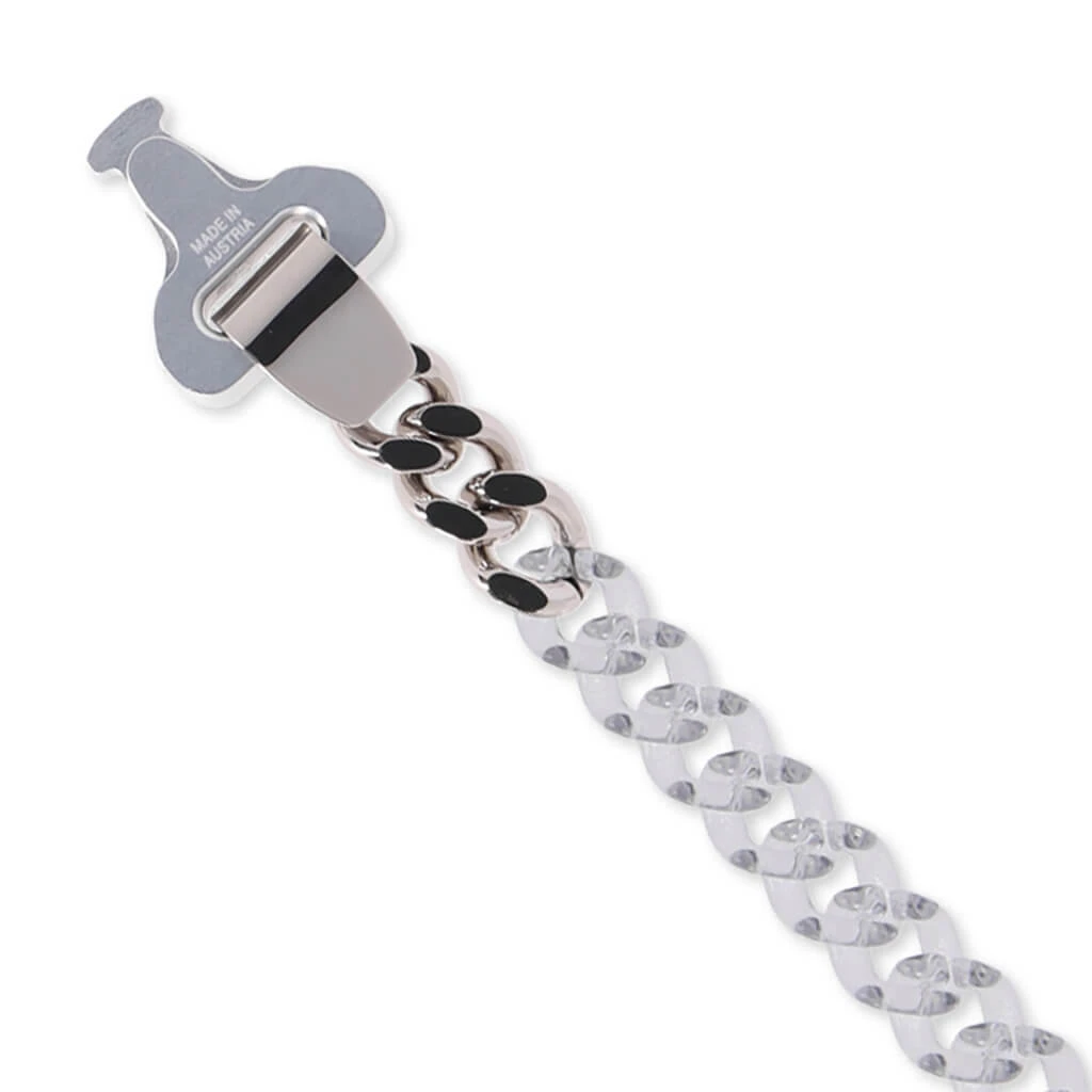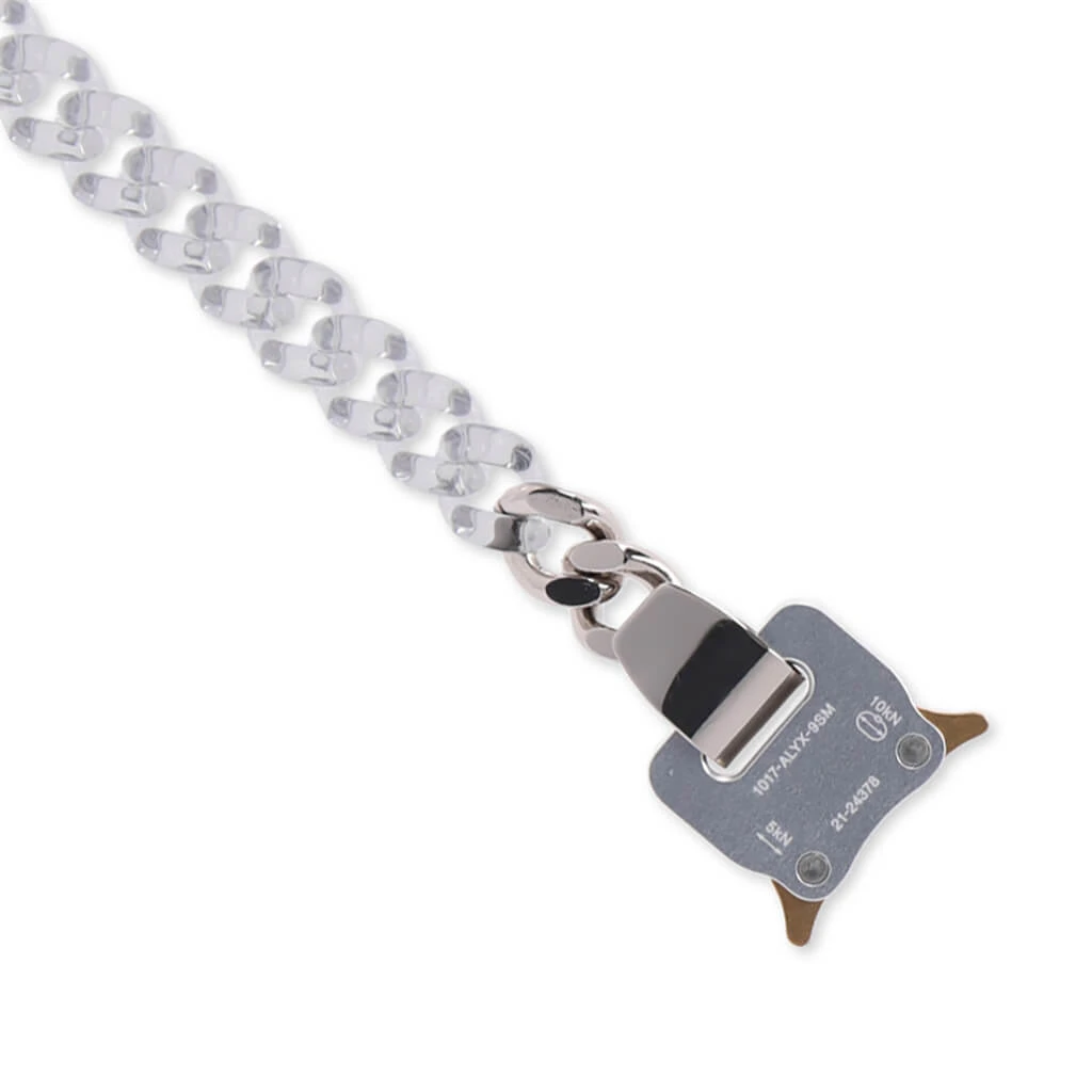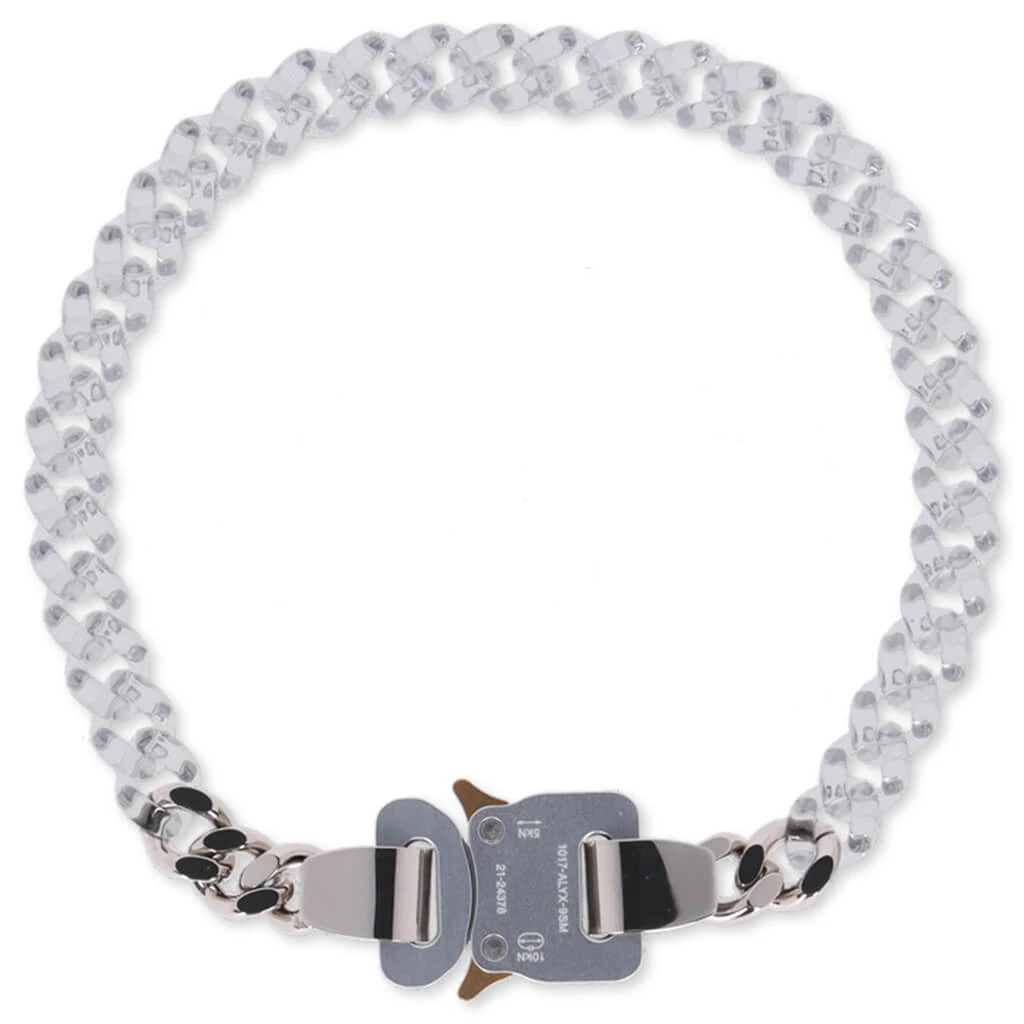The latest 1017 Alyx 9SM necklace makes an impression. Composed of nylon and brass, the chain necklace is made with hand-treated colorized finishing and a small anodized aluminum buckle with lasered branding. The metal buckle closure finishes the rest of the look.