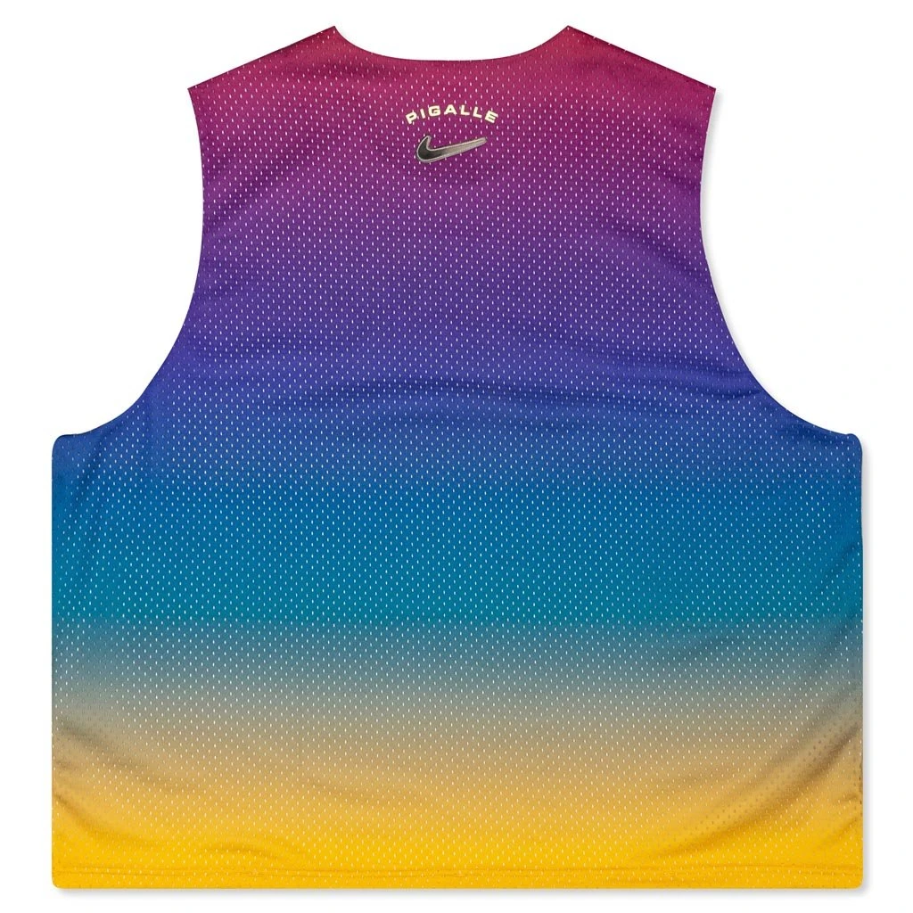 Pigalle and Nike join forces for a collection that blends art and sports. Inspired by the bold attitude and natural style of enthusiastic basketball players around the world. Combining Nikes modern functional materials and a unique Parisian style this collaboration firmly supports the message that the power of sports changes the world and conveys the worlds fascination with basketball. Pictured is the Nike x Pigalle NRG Tank Jersey in Court Purple.