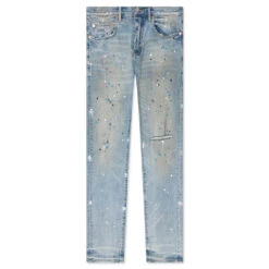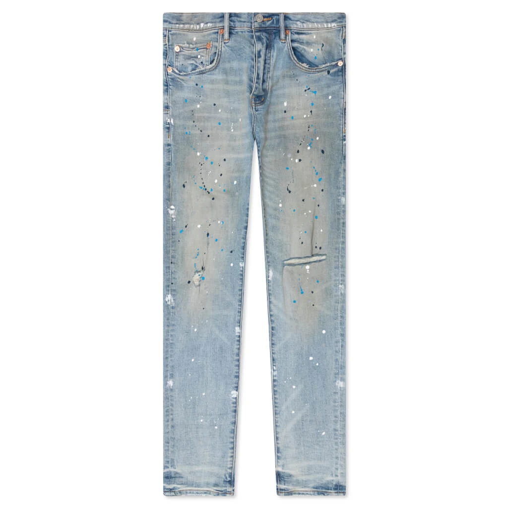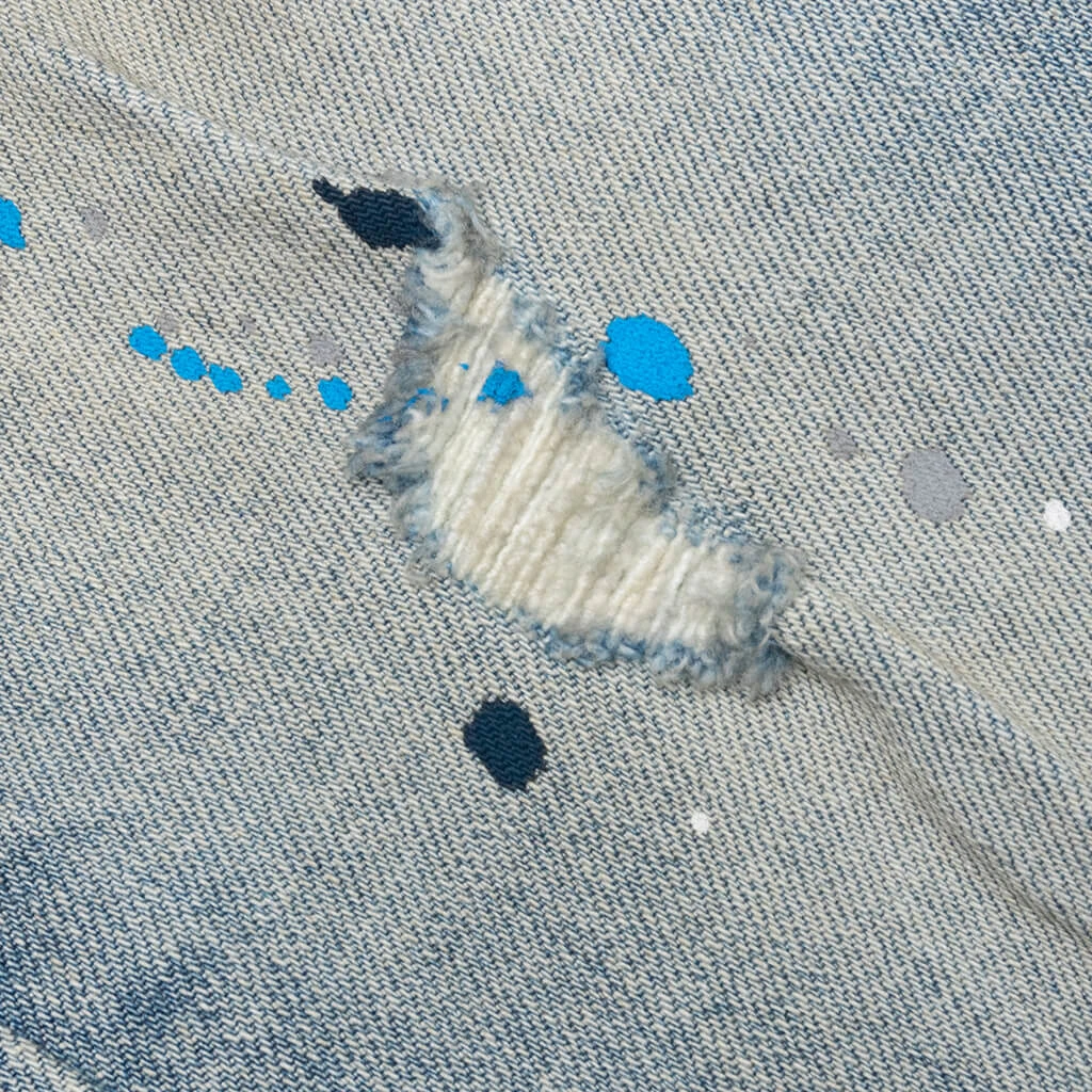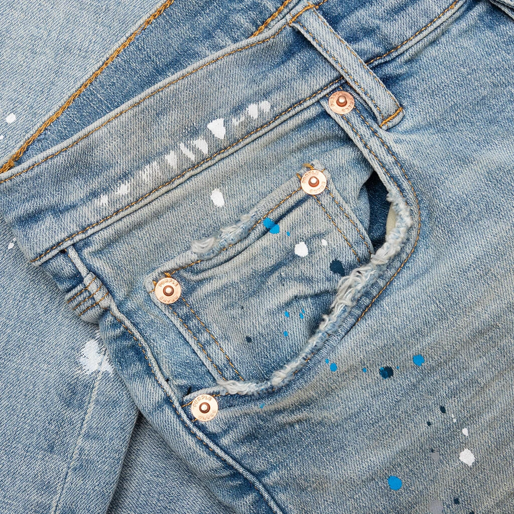 Taking on distinct details, the P001 design is seen in the latest colorway, Light Indigo Painter Jean. The casual pant is made for a low rise and slim leg, an ideal fit for modern times. Featured attributes include paint splatter motifs, distressed details, and premium cotton and elastane fabric blend emphasizing its comfort.