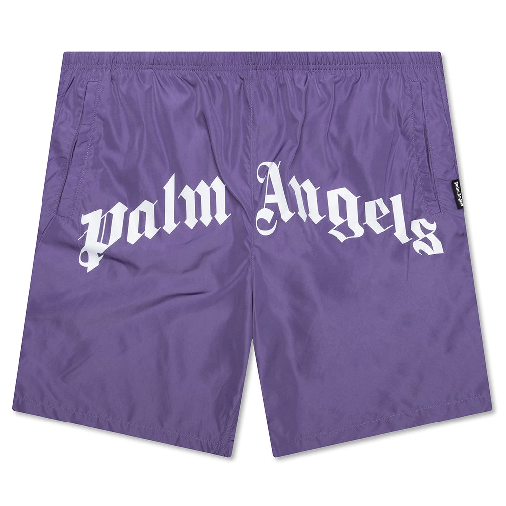 The polyamide-crafted Palm Angels Curved Logo Swim Short makes an impression on any apparel collection. The design includes an elastic waistband paired with side pockets and a singular rear pocket. The screen-printed logo graphic at the front finishes up the look.