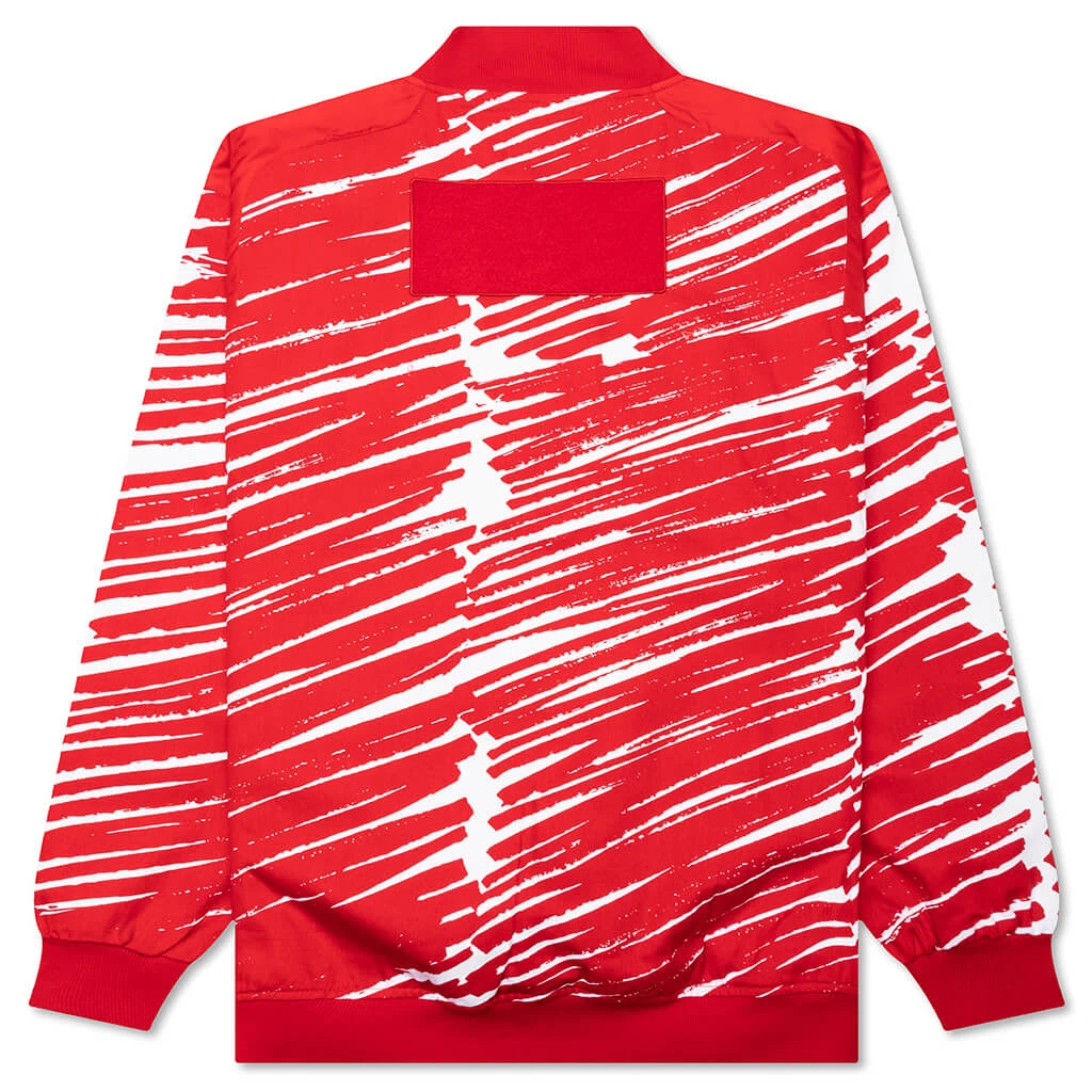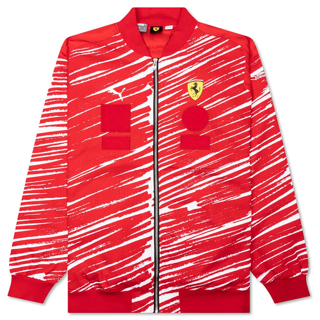 PUMA and sports car manufacturer Ferrari joins Southern California artist Joshua Vides to create a collection of motorsport-themed apparel and accessories. The Ferrari Race Jacket captures the essence of supercar engineering and the creativity of Joshua Vides’ visionary art. This jacket silhouette adds an elevated edge to the everyday look with its bold red and white striped design. Branded screen printing across the chest and a ribbed collar adds a finishing touch.