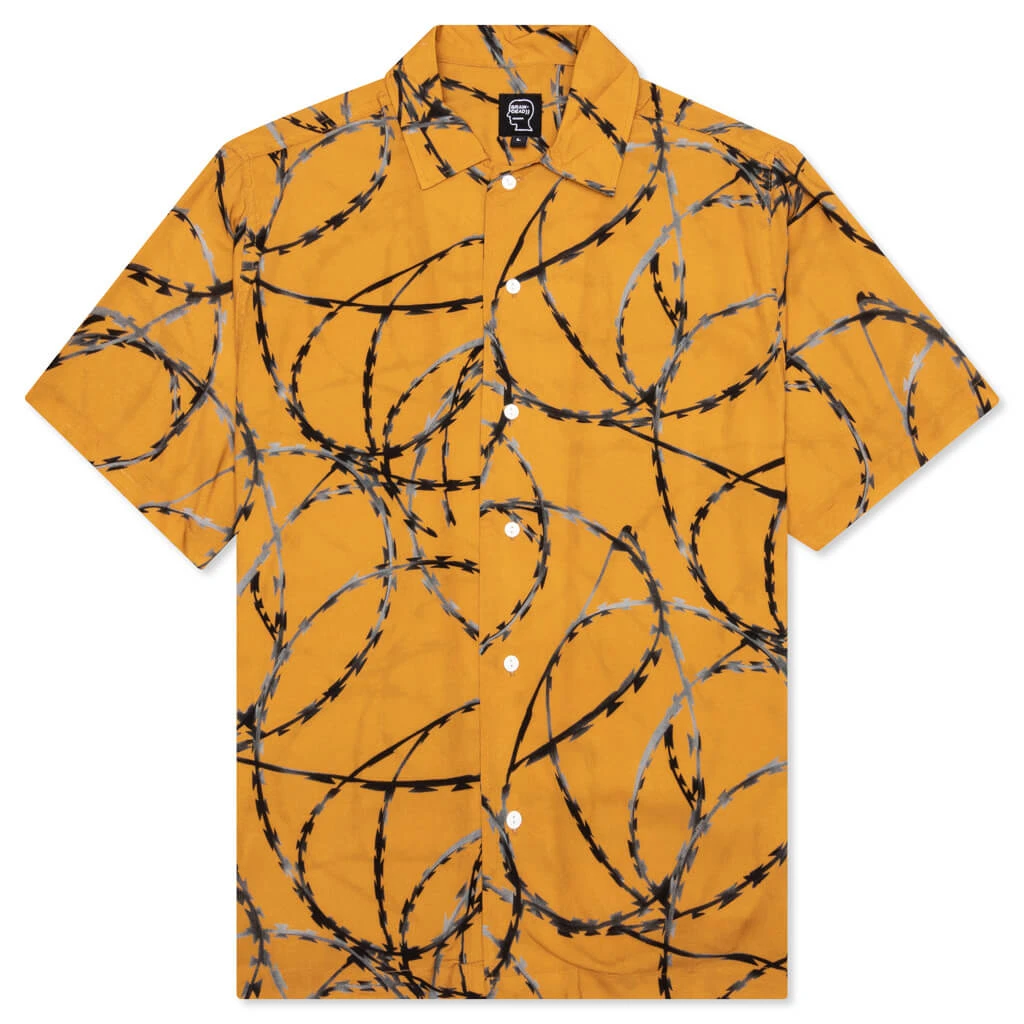 Traditional styles are given an eccentric touch as seen with the Razorwire Rayon Shirt from Brain Dead. Constructed with complete rayon, the button-up includes a pressed collar and printed imagery throughout.