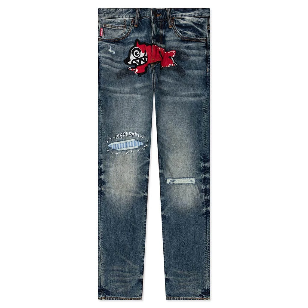 ICECREAM takes an elevated approach to everyday wear with the Reduce Reuse Repair Jean. The silhouette is composed of complete cotton for a high-quality stretch denim feel to the design. A signature running dog motif is placed at the front of the jeans, while the zip-fly closure is placed above. Distressed detailing completes the design.
