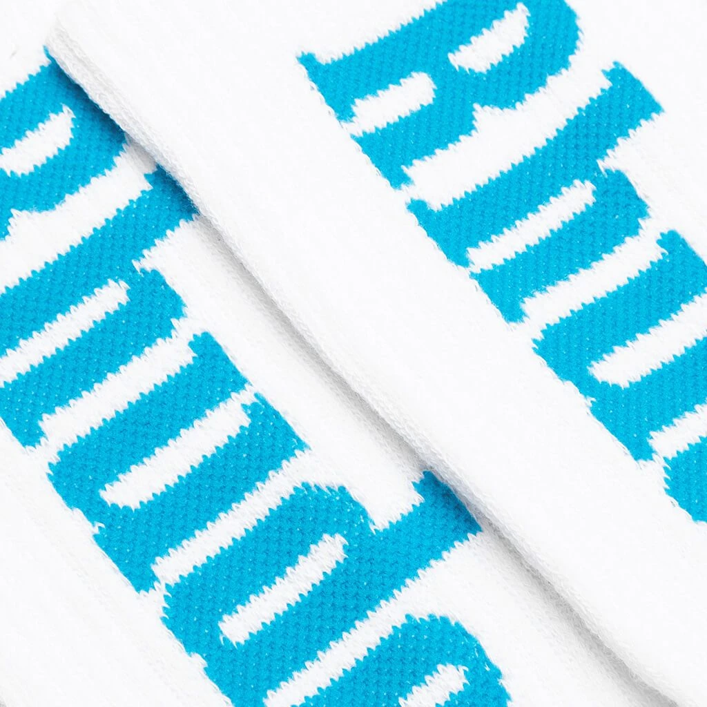 Founded by Rhuigi in 2013, Rhude focuses on simplicity and effortless style mixed with street wear sensibilities, using fine fabrics and the perfect fit. All products are made in USA with the best fabrics sourced from different parts of the world. Pictured is the Rhude RH Vertical Print Socks in White/Blue.