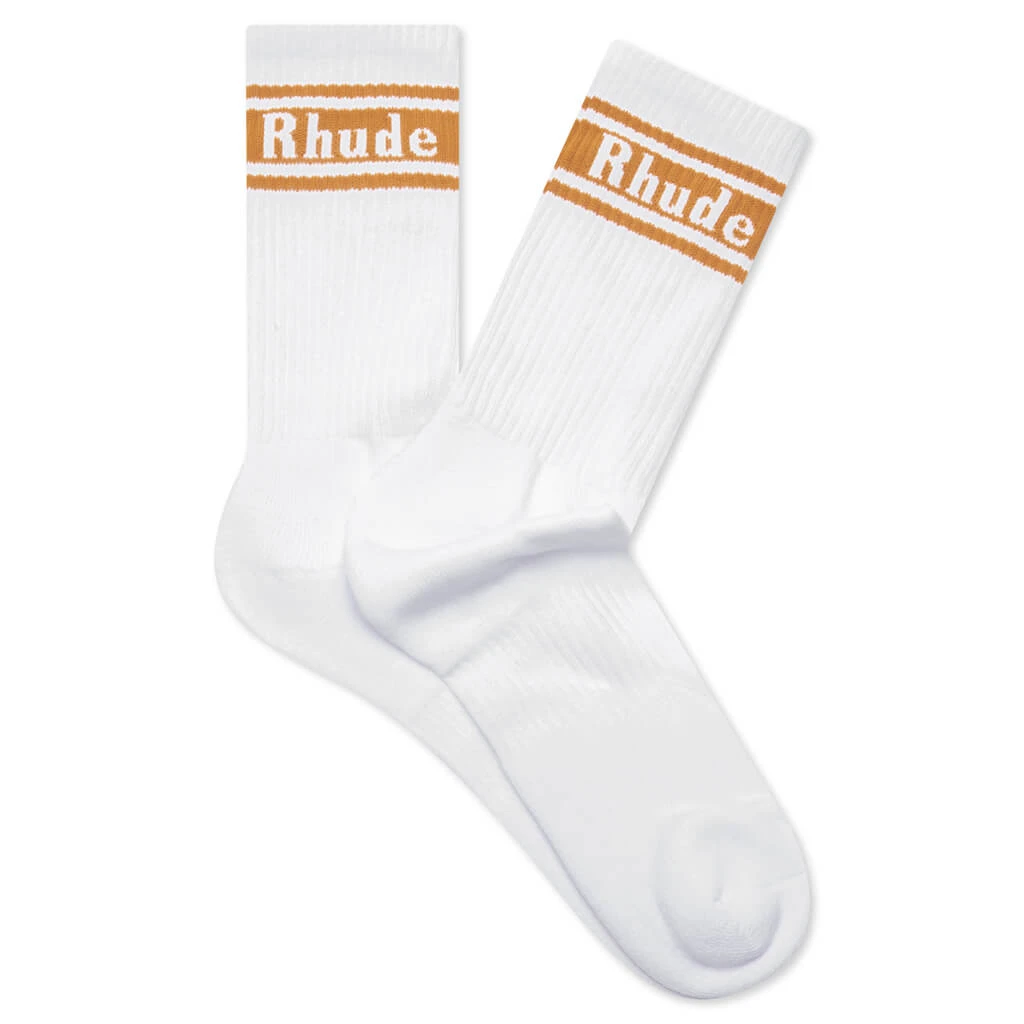 Add a premium accessory into your rotation with the Rhude Stripe Logo Sock. Composed of a blend of cotton, nylon, polyester, and spandex, the design features stitched branding at the ankle. The ribbed detailing finishes the look.