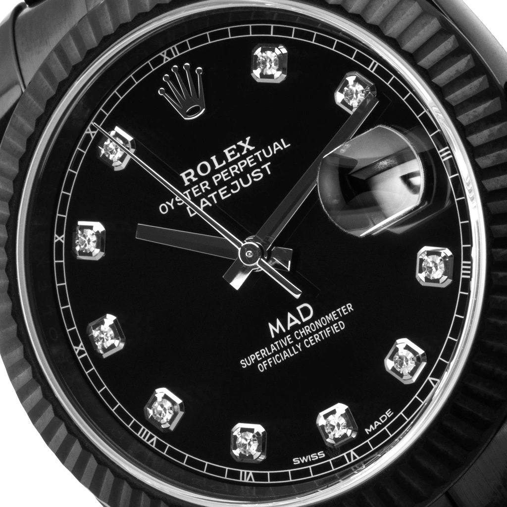 The MAD workshop has executed stunning transformations on the most emblematic models in the industry. From the likes of Rolex, Richard Mille and Patek Philippe there is no limit to what you can achieve with the craftsmanship offered by their technicians. Their mission? To unleash creativity and give yourself the dream watch. Each MAD watch is delicately taken apart and reconstructed by MAD’s expert watchmakers. While each individual part of the watch is custom hand painted and coated in diamond-like carbon, MAD ensures to keep the original model’s unique construction in tact. Because MAD is an independent brand and not affiliated with any watch brand nor is it an authorized reseller, the manufacturer’s original guarantee is no longer valid. Pictured is the Mad Paris Rolex Datejust 41MM in Black Dial/White Diamonds.