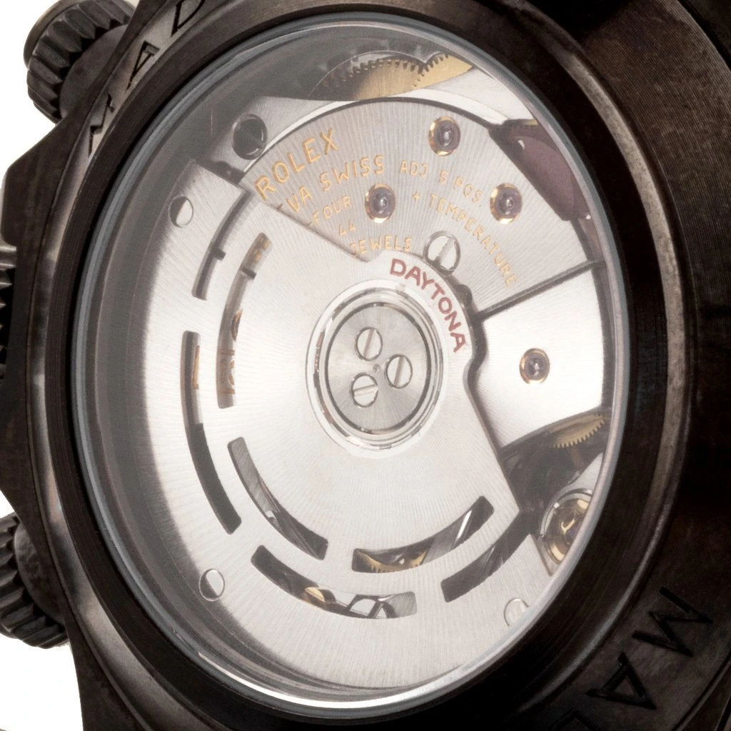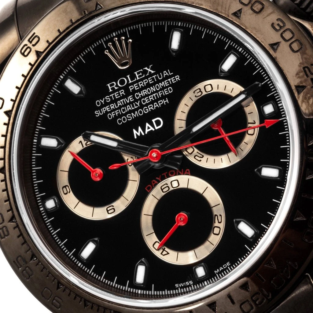The MAD workshop has executed stunning transformations on the most emblematic models in the industry. From the likes of Rolex, Richard Mille and Patek Philippe there is no limit to what you can achieve with the craftsmanship offered by their technicians. Their mission? To unleash creativity and give yourself the dream watch. Each MAD watch is delicately taken apart and reconstructed by MAD’s expert watchmakers. While each individual part of the watch is custom hand painted and coated in diamond-like carbon, MAD ensures to keep the original model’s unique construction in tact. Because MAD is an independent brand and not affiliated with any watch brand nor is it an authorized reseller, the manufacturer’s original guarantee is no longer valid. Pictured is the Mad Paris Rolex Daytona in Black Dial/Red Details.