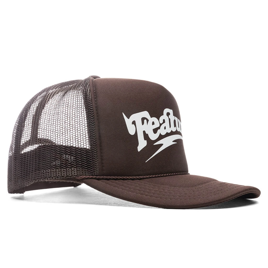 Represent FEATURE with the exclusive FEATURE Spike Trucker Hat. The front of the silhouette incorporates polyester foam for comfort. A screen-printed FEATURE logo is placed at the face of the hat, highlighting its design. With a structured front and curved brim, breathable netted material is recognized throughout the rest of the exterior. An adjustable strapback closure completes the design.