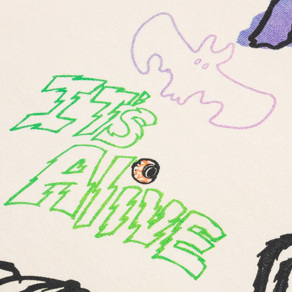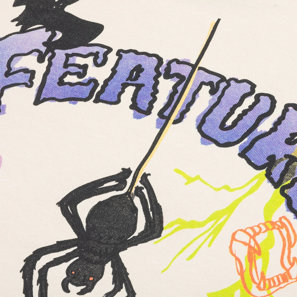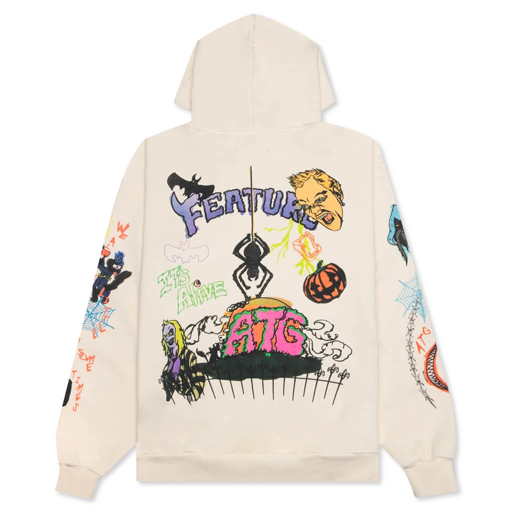Our FEATURE Halloween-inspired capsule incorporates Halloween concepts displayed through unique screen-printed graphics, as seen in the FEATURE Spirits Hoodie. Crafted from medium-weight cotton material, the hoodie features screen-printed Halloween motif cartoon doodles interlaced with FEATURE branding throughout the silhouette. The hoodie is made domestically and offers both high-quality and unique aesthetics in its design. A signature kangaroo pocket along with ribbed trims and hem complete the look.