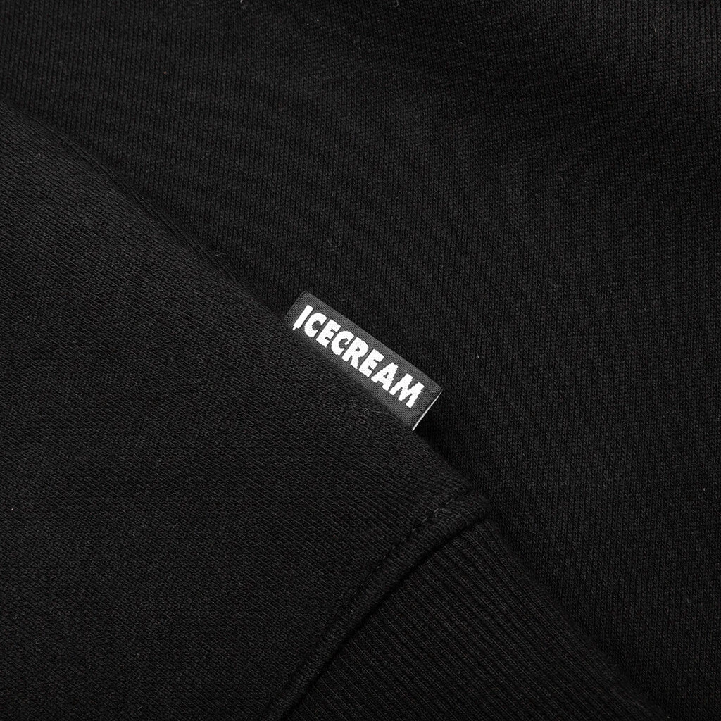 The ICECREAM Sticker Hoodie elevates the traditional silhouette. The signature Running Dog motif is screen-printed on the chest but appears as a peeling sticker, which adds a unique touch to the design. The garment is cut from 100% cotton and features a hooded collar with an adjustable drawstring. The look is completed with a kangaroo pocket and ribbed trims.