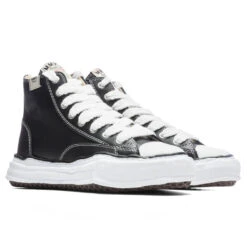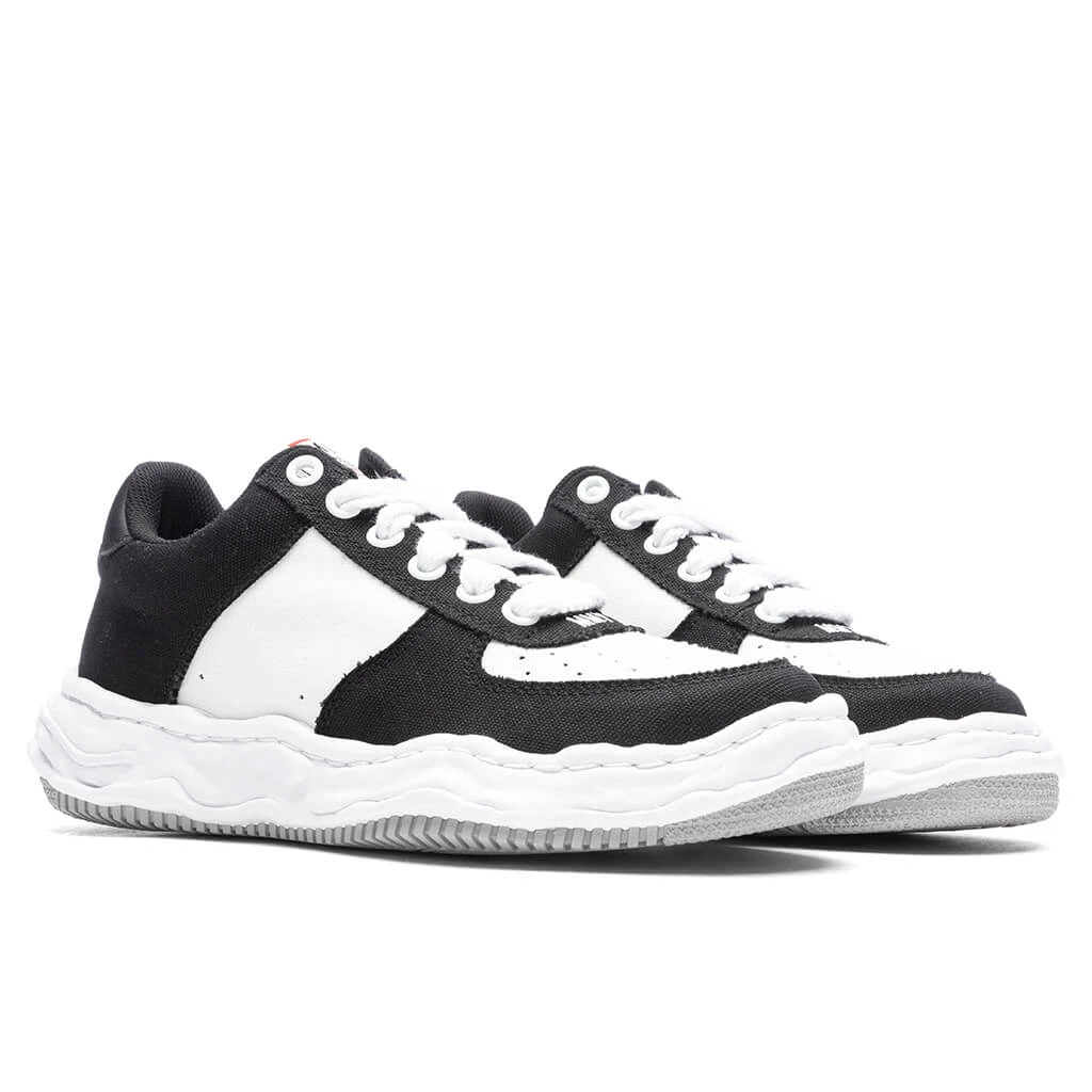 Maison Mihara Yasuhiro footwear embodies elevated and sculptural-inspired components, which are proudly displayed within the Wayne Low sneaker. Featuring a leather upper and canvas overlays, the silhouette includes a two-tone design and a perforated toe box for breathability. The logo patch at the tongue makes a statement, while the chunky lace-up closure provides security. The silhouette is tied together with a sculptural midsole and chunky rubber outsole, resulting in guaranteed durability.